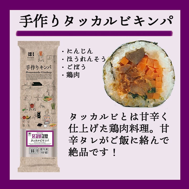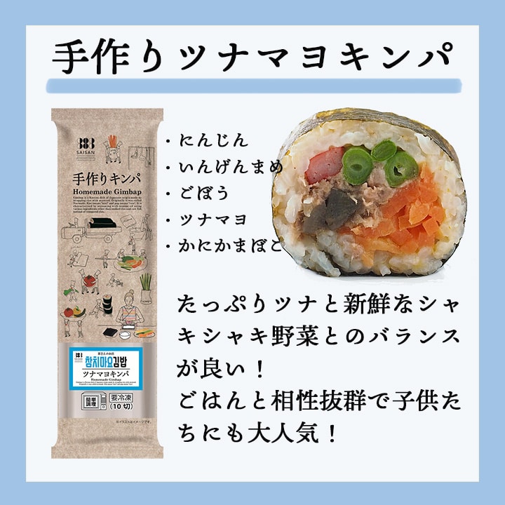 本格的な豚キムチが入っているキンパです。 酢飯を使わず作っているためお米がべちゃっとせず、味付けはもちろん見た目も満足できる本場のキンパです! 冷凍のままレンジでチンする簡単調理! <美味しいお召し上がり方> 袋を1~2cm開封し、袋ごと電子レンジ(600W3分30秒)で解凍してください。 そのまま15分間おいて、全体の温度が均一になじんでから、お召し上がりください。 ※冷たい場合は、10秒ずつ追加して加熱してください。 【商品名】冷凍豚キムチキンパ 【原材料名】うるち米(国産)、野菜(人参(中国産)、ほうれんそう、ごぼう)、キムチ(白菜、ニラ、その他)、豚肉(カナダ産)、食用ごま油、みりん、昆布、焼きのり、しょうゆ、ごま、植物油脂、食塩、砂糖、醸造調味料、粉末キムチの素/調味料(アミノ酸等)、トレハロース、アルコール、増粘多糖類、酸味料、pH調整剤、(一部にえび・小麦・乳成分・ごま・大豆・豚肉・りんごを含む) 【内容量】275g(1本10切) 【賞味期限】30日以上保証 【保存方法】要冷凍(-18℃以下で保存) 【配送方法】冷凍便