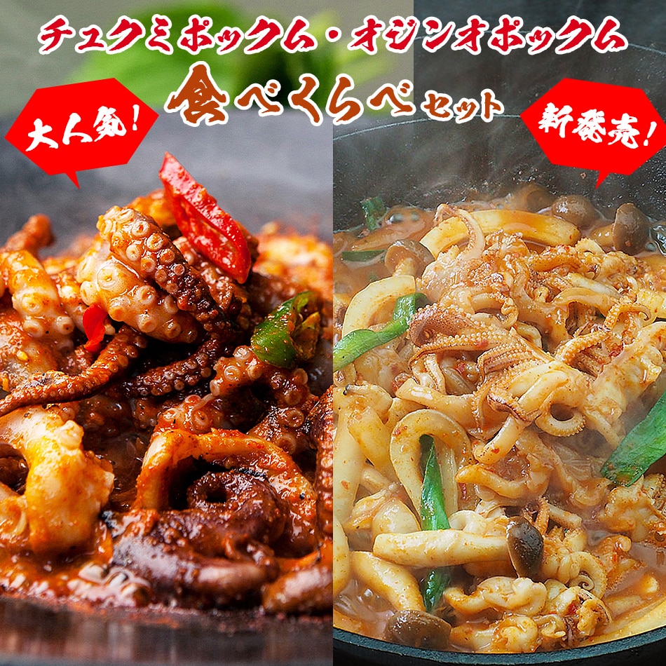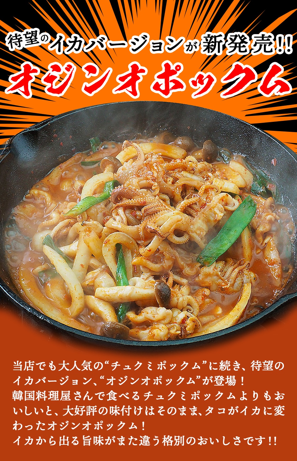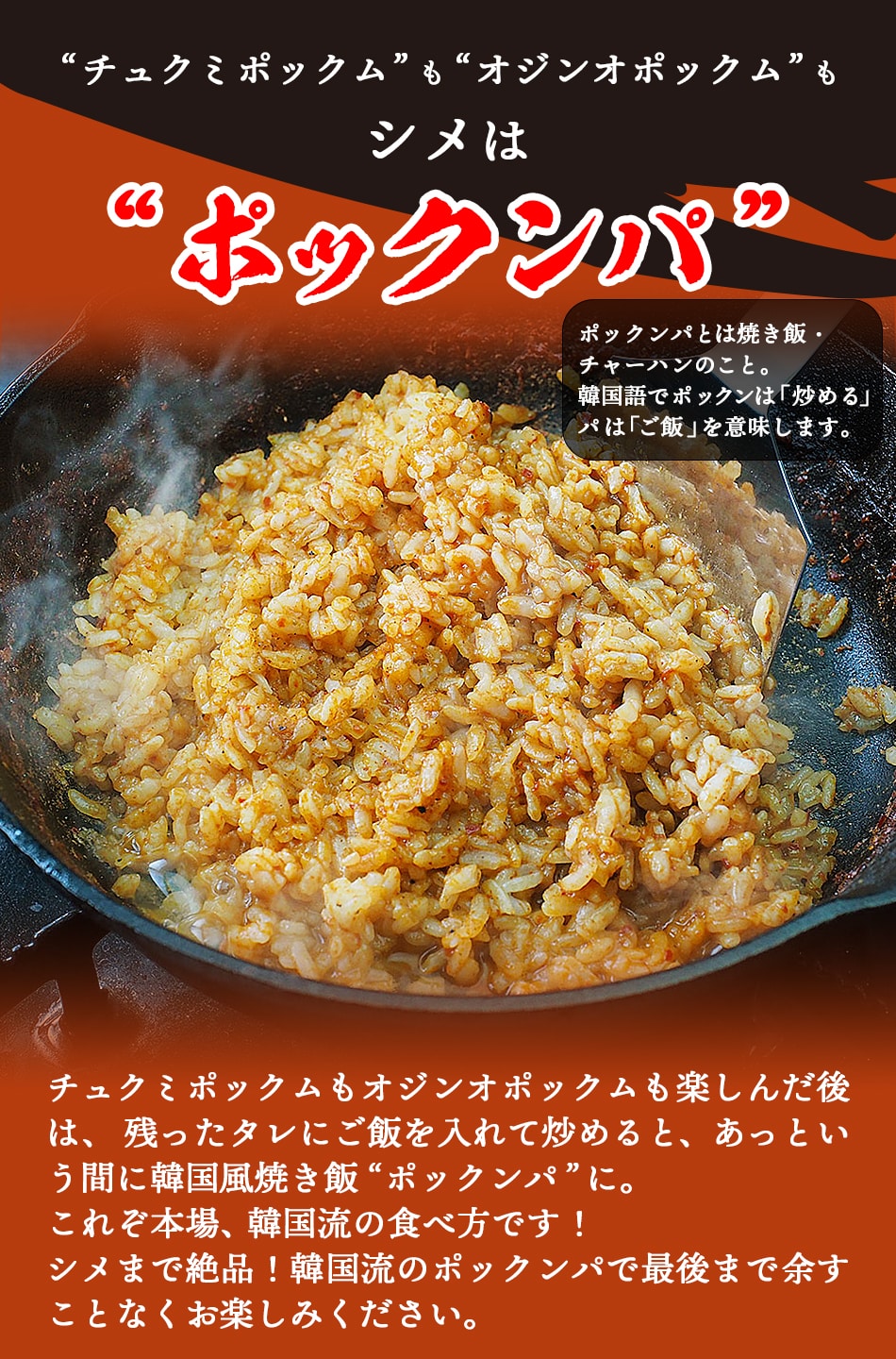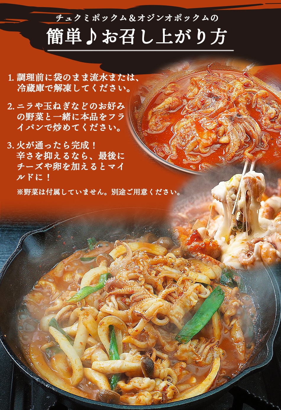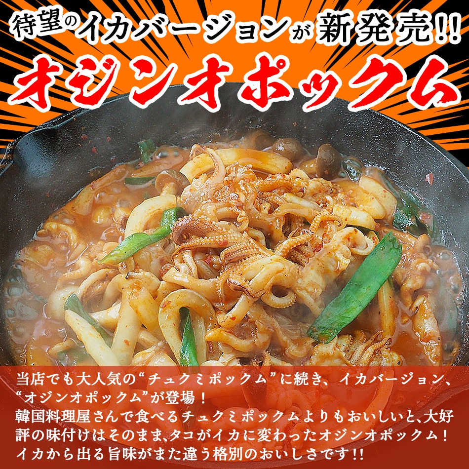 今大人気の韓国料理 チュクミポックム。イイダコのぷりっぷりの食感とやみつきになる辛さが特長です。特製のコチュジャンで味付けした状態で冷凍でお届けしますので、野菜を加えて炒めるだけの簡単調理。本格的なチュクミポックムがご自宅で簡単に味わえます。※野菜は別途ご用意ください。 また、もう一つの隠れた人気商品チュクミのイカバージョン「オジンオポックム」をセット!韓国の定番家庭料理で、ぷりっとしたイカの食感とやみつきになる辛さが特長です。※野菜は別途ご用意ください。 【商品内容】チュクミポックム300g、オジンオポックム 300g 【原材料名】 ●チュクミポックム:イイダコ(ベトナム産又はインドネシア産)、たれ【醤油、発酵調味料、香辛料、三温糖、にんにく、ごま油、魚醤、しょうが、すりごま、こんぶエキスパウダー、コーンスターチ、醸造酢、焼あごパウダー、かつお風味調味料、食塩/調味料(アミノ酸等)、(一部に大豆・小麦・ごまを含む) ●オジンオポックム:やりいか(インドネシア産)、たれ【醤油、発酵調味料、香辛料、三温糖、にんにく、ごま油、魚醤、しょうが、すりごま、こんぶエキスパウダー、コーンスターチ、醸造酢、焼あごパウダー、かつお風味調味料、食塩/調味料(アミノ酸等)、(一部に大豆・小麦・ごまを含む) 【賞味期限】冷凍30日以上保証 【保存方法】要冷凍(-18℃以下) 【配送方法】冷凍便