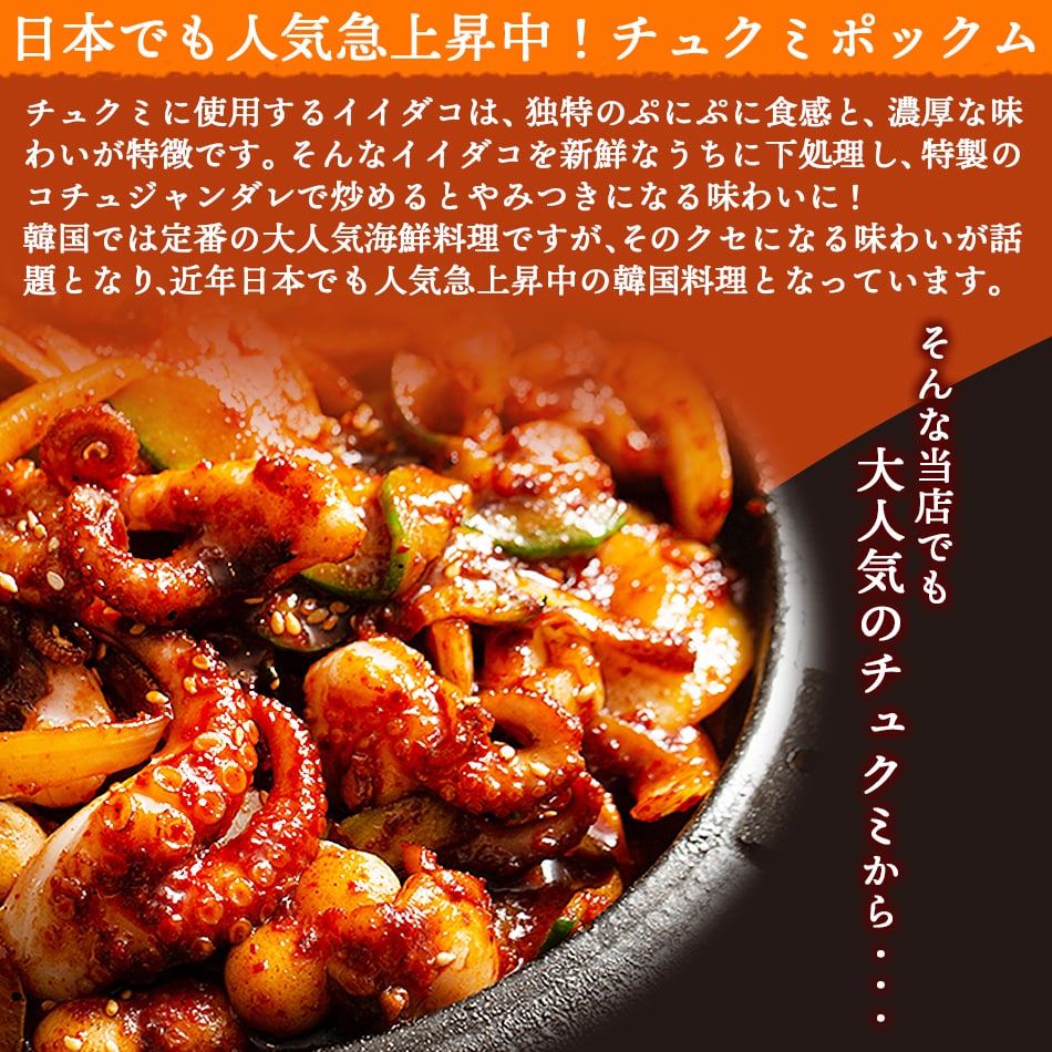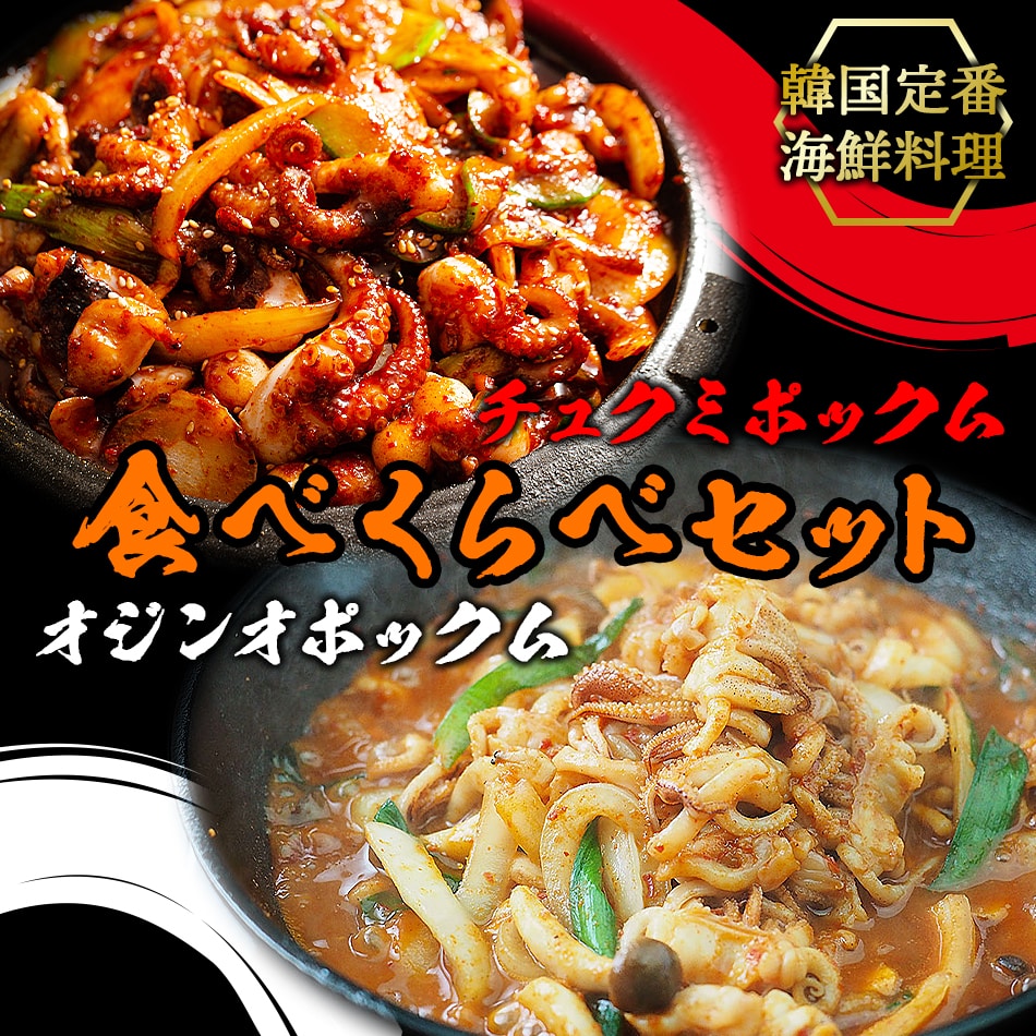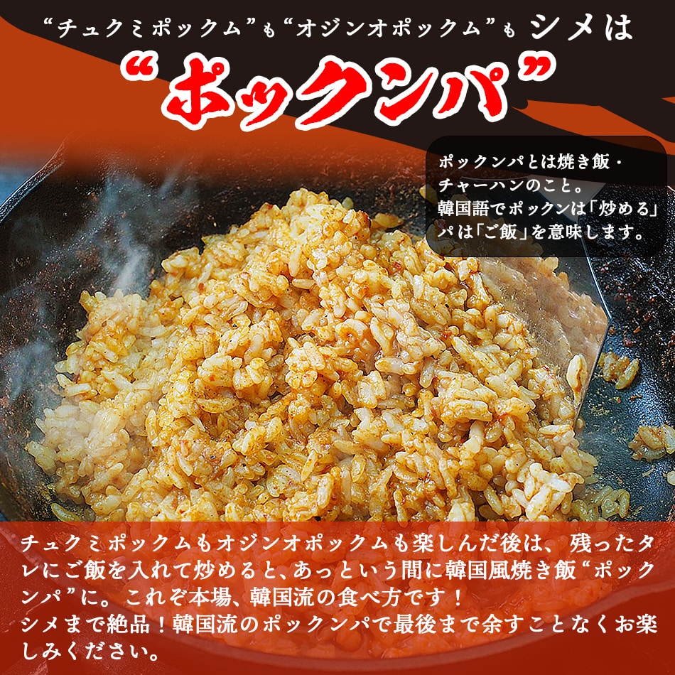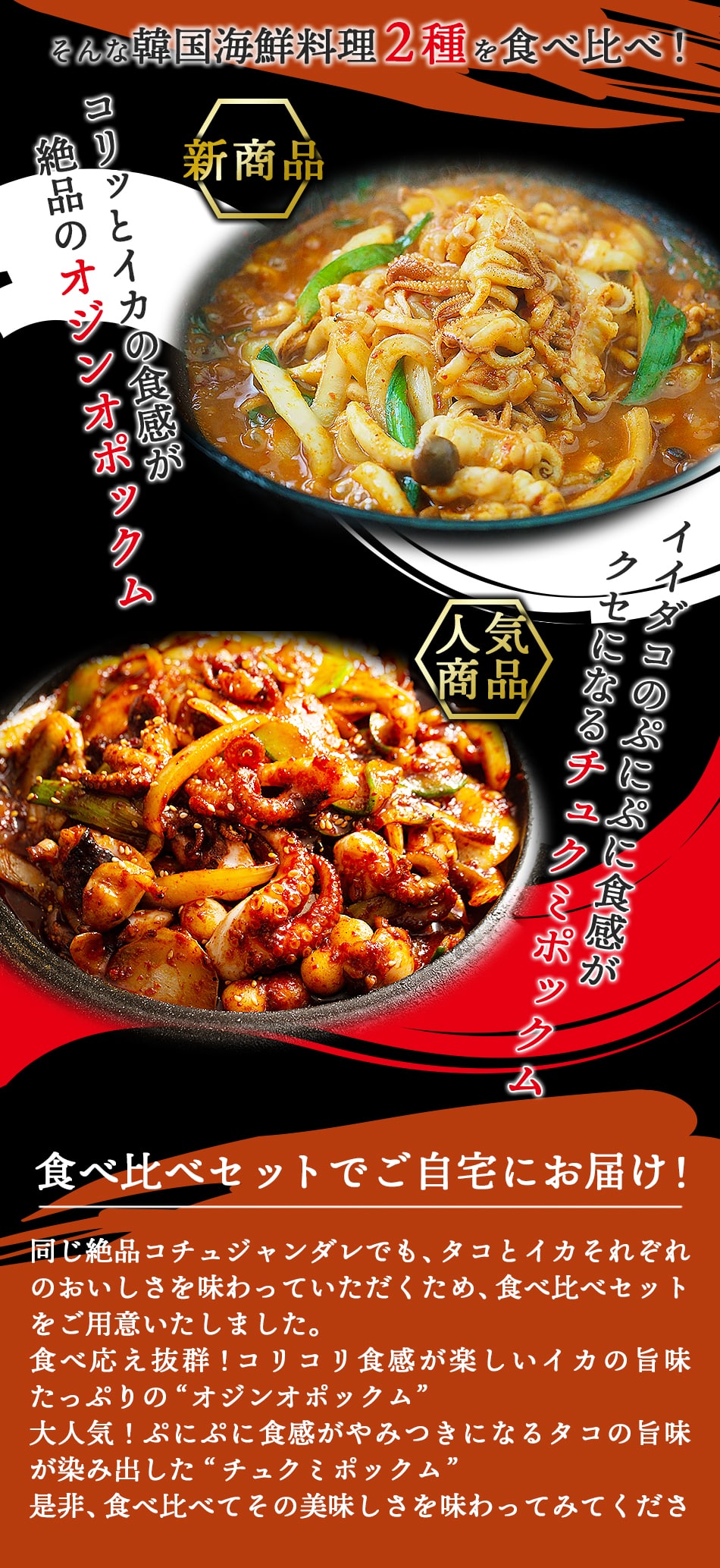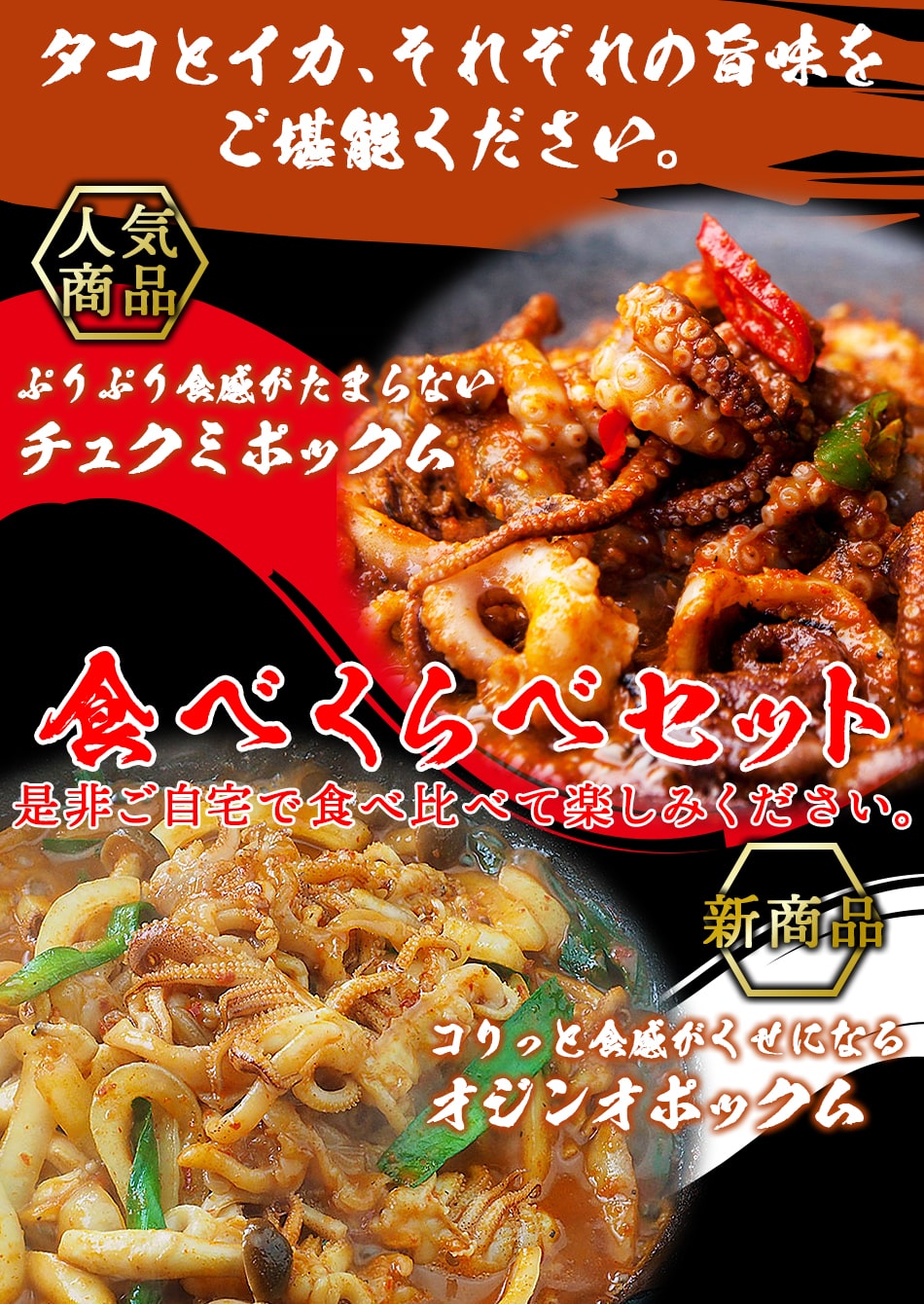 今大人気の韓国料理 チュクミポックム。イイダコのぷりっぷりの食感とやみつきになる辛さが特長です。特製のコチュジャンで味付けした状態で冷凍でお届けしますので、野菜を加えて炒めるだけの簡単調理。本格的なチュクミポックムがご自宅で簡単に味わえます。※野菜は別途ご用意ください。 また、もう一つの隠れた人気商品チュクミのイカバージョン「オジンオポックム」をセット!韓国の定番家庭料理で、ぷりっとしたイカの食感とやみつきになる辛さが特長です。※野菜は別途ご用意ください。 【商品内容】チュクミポックム300g、オジンオポックム 300g 【原材料名】 ●チュクミポックム:イイダコ(ベトナム産又はインドネシア産)、たれ【醤油、発酵調味料、香辛料、三温糖、にんにく、ごま油、魚醤、しょうが、すりごま、こんぶエキスパウダー、コーンスターチ、醸造酢、焼あごパウダー、かつお風味調味料、食塩/調味料(アミノ酸等)、(一部に大豆・小麦・ごまを含む) ●オジンオポックム:やりいか(インドネシア産)、たれ【醤油、発酵調味料、香辛料、三温糖、にんにく、ごま油、魚醤、しょうが、すりごま、こんぶエキスパウダー、コーンスターチ、醸造酢、焼あごパウダー、かつお風味調味料、食塩/調味料(アミノ酸等)、(一部に大豆・小麦・ごまを含む) 【賞味期限】冷凍30日以上保証 【保存方法】要冷凍(-18℃以下) 【配送方法】冷凍便