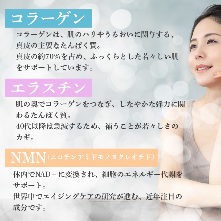 【名称】エラスチン含有食品 【原材料名】コラーゲンペプチド(ゼラチンを含む)(ドイツ製造)、ショ糖、β-ニコチンアミドモノヌクレオチド、レモン果汁末(デキストリン、レモン果汁)、ムラサキ芋搾汁末、エラスチンパウダー(豚肉を含む)、パイナップル果汁末、でん粉、銅含有酵母/ビタミンC、香料、クエン酸、甘味料(ステビア)、シェラック 【内容量】66g(30包) 【賞味期限】2026年4月 【保存方法】直射日光・高温多湿を避け、涼しいところで保存してください。 【召し上がり方】健康補助食品として、1日1包を目安に水またはぬるま湯と一緒にお召し上がりください。 【使用上の注意】 ●食物アレルギーのある方は、原材料をよくご確認ください。 ●体質や体調により、まれに合わない場合があります。異変を感じた際は速やかに摂取を中止し医師にご相談ください。 ●疾病に羅患している方や妊婦・授乳中の方は医師に、医薬品を服用している方は医師、薬剤師にご相談ください。 ●開封後は、賞味期限にかかわらずお早めに召し上がりください。 ●食生活は、主食、主菜、副菜を基本に、食事のバランスを。 【栄養成分表示 1包2.2g当たり】 エネルギー8Kcal、たんぱく質1.25g、脂質0.01g、炭水化物0.81g、食塩相当量0.016g この表示値は目安です。 【配送方法】常温便