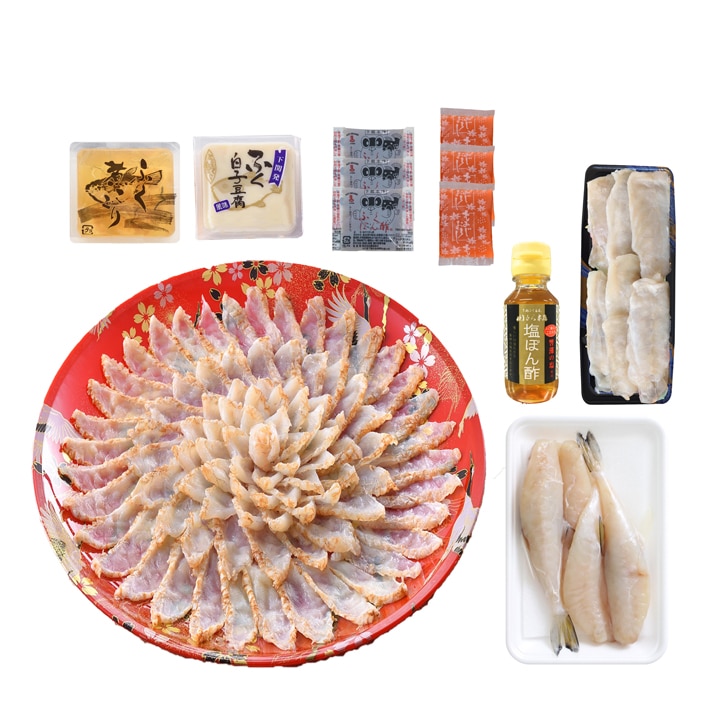 ふくの本場下関の熟練した職人が薄く透き通るように1枚1枚丁寧に盛り付けたふくたたき刺身。繊細な見た目だけでなく、口に入れた瞬間に感じる独特の食感と淡泊ながらも深い味わいがあります。さっぱりとした塩ポン酢でお召し上がりください。 1匹のふくから2枚しかとれない希少部位の「身皮」は、しゃぶしゃぶ用としても焼きふく用としてもお召し上がりいただけます。独特の食感と旨味をお楽しみください。 さらに一夜干し・ふく煮こごり・ふく白子豆腐などふくづくしの商品をご堪能ください。 【商品内容】真ふぐたたき刺身(30cm皿)180g、とらふぐすき身(身皮)75g、ふぐ一夜干し150g、ふぐ白子豆腐130g、ふぐ煮こごり100g、塩ポン酢100ml、ふくポン酢10g×3、もみじおろし10g×3 【原産地】マフグ(山口県産)、トラフグ(長崎県産、熊本県産:養殖)、シロサバフグ(福岡県産、長崎県産)、食塩(山口県産)、大根(国産) 【アレルギー指定食品(28品目)】小麦・乳成分・いか・さば・大豆・豚肉・ゼラチン 【賞味期限】冷凍90日 【保存方法】要冷凍(-18℃以下で保存) 【配送方法】冷凍便 ※こちらの商品はメーカー直送の為、他の商品とは同梱出来ません。