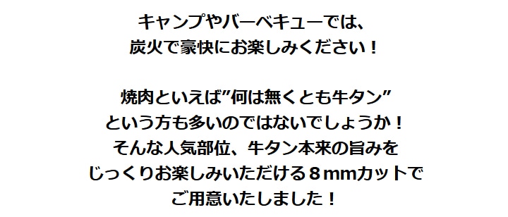 8mmの厚さで食べ応え満点! 柔らかくて旨みも濃厚なタン元とタン中をメインに使用しています。 【商品内容】牛タンスライス1kg ※味付け加工はしていませんので、お好みのタレや味付けでお召し上がりください。 【原材料名】牛タン(ニュージーランド産) 【賞味期限】冷凍30日以上保証 ※解凍後はお早めにお召し上がりください。 【保存方法】要冷凍(-18℃以下) 【配送方法】冷凍便