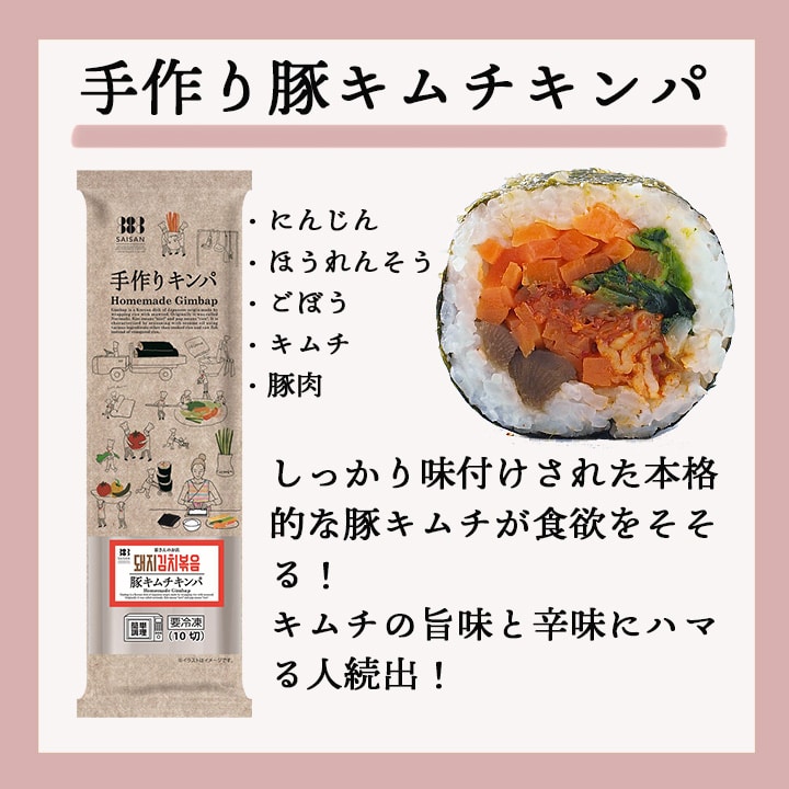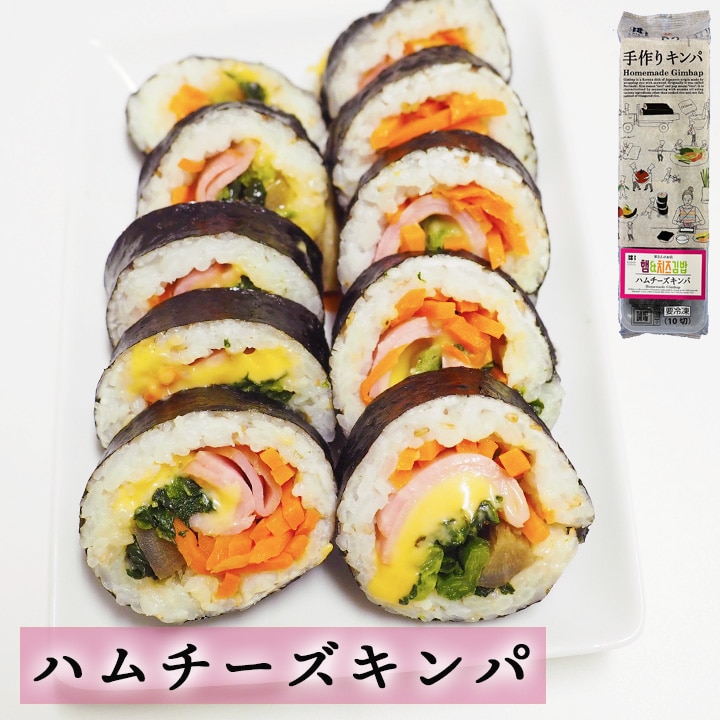 ハムとチーズが入っているキンパです。 酢飯を使わず作っているためお米がべちゃっとせず、味付けはもちろん見た目も満足できる本場のキンパです! 冷凍のままレンジでチンする簡単調理! <美味しいお召し上がり方> 袋を1~2cm開封し、袋ごと電子レンジ(600W3分30秒)で解凍してください。 そのまま15分間おいて、全体の温度が均一になじんでから、お召し上がりください。 ※冷たい場合は、10秒ずつ追加して加熱してください。 【商品名】冷凍ハムチーズキンパ 【原材料名】野菜(ほうれんそう、(中国産)、人参、ごぼう)、うるち米(国産)、ロースハム、プロセスチーズ、食用ごま油、昆布、みりん、焼きのり、ごま、しょうゆ、植物油脂、食塩、砂糖、醸造調味料/乳化剤、調味料(アミノ酸等)、トレハロース、酸化防止剤(V.C)、着色料(カロテノイド、コチニール、クチナシ)、くん液、発色剤(亜硝酸Na)、アルコール、ゲル化剤(加工でん粉、増粘多糖類)、リン酸塩(Na)、レシチン、pH調整剤、(一部に小麦・卵・乳成分・ごま・大豆・豚肉・ゼラチンを含む) 【内容量】275g(1本10切) 【賞味期限】30日以上保証 【保存方法】要冷凍(-18℃以下で保存) 【配送方法】冷凍便