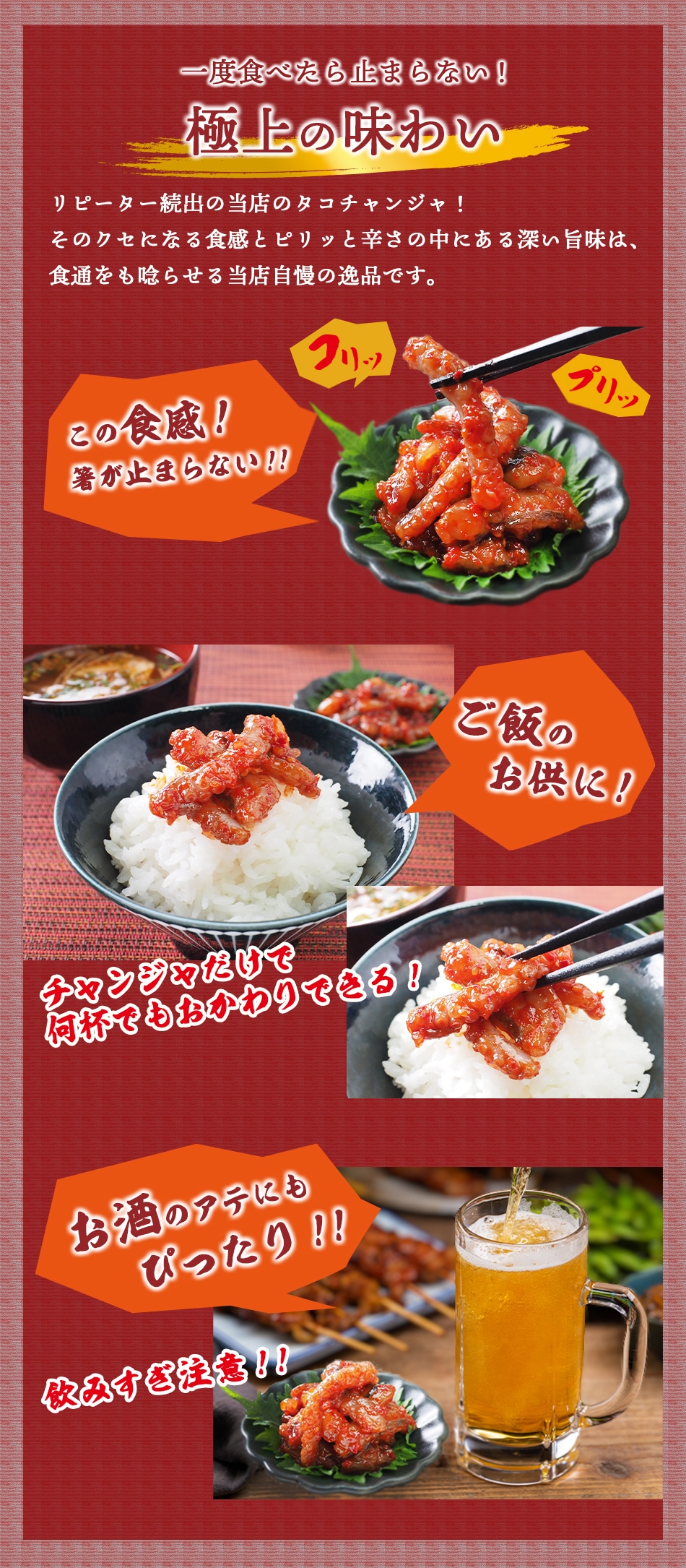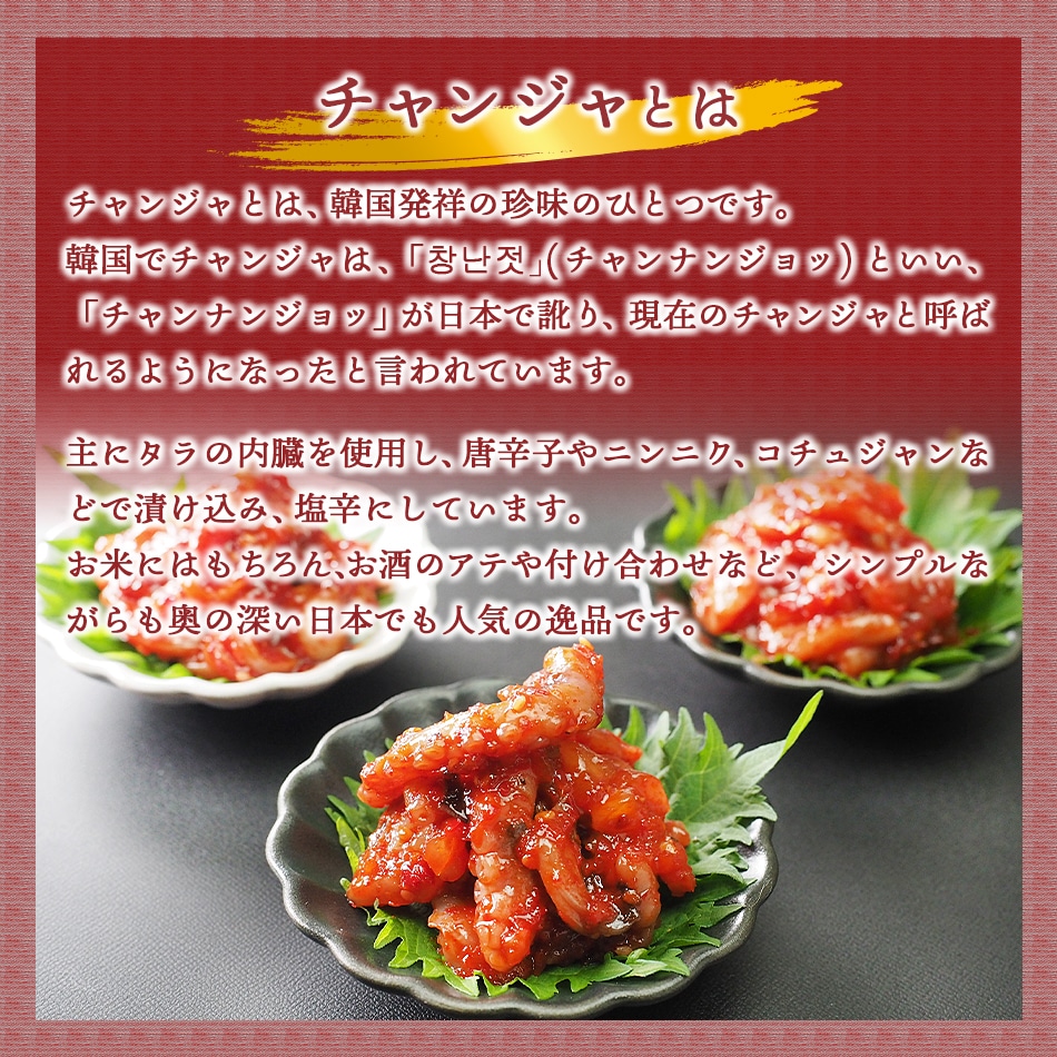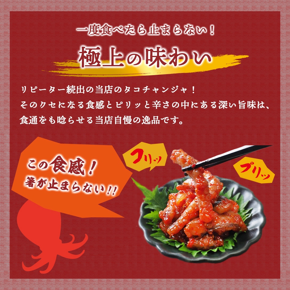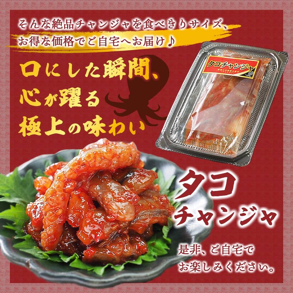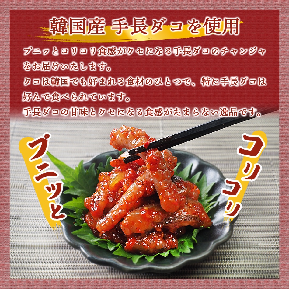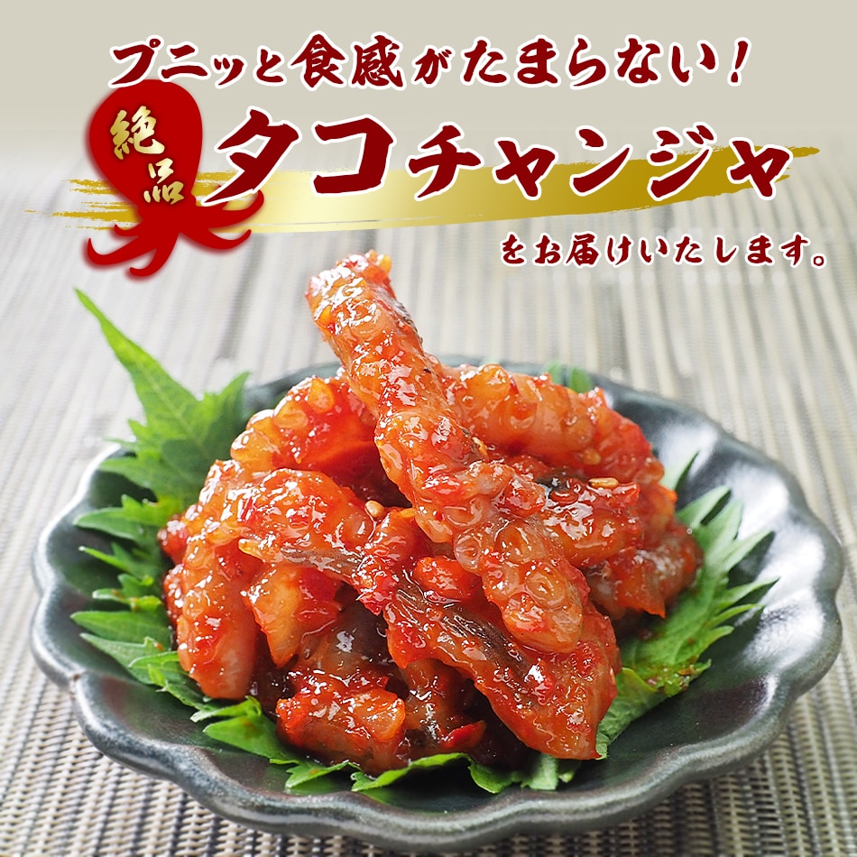 たこは韓国でもとても好まれる食材のひとつで、特に手長だこは好んで食べられています。たこの甘い身の味わいと、ぷりぷりとした食感がくせになる一品です。 【商品内容】タコチャンジャ60g 【原材料名】手長タコ(韓国産)、食塩、唐辛子、水あめ、ニンニク、砂糖、サイダー、生姜、玉ねぎ、ゴマ / パプリカ色素、ソルビトール、調味料(アミノ酸等)、(一部にごまを含む) 【賞味期限】製造日より10日 【保存方法】要冷蔵(5℃以下) 【配送方法】冷蔵便