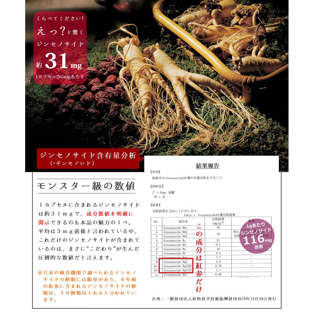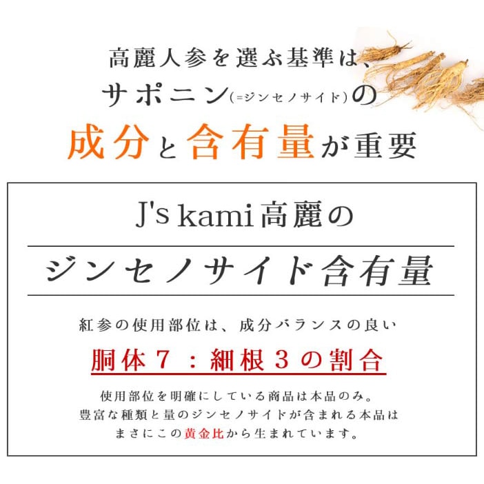 【商品内容】J's Kami高麗 10カプセル 【内容量】3.42gg【1粒重量342mg(内容量265mg)×10】 【原材料名】高麗人参エキス粉末/ゼラチン、カラメル色素、pH調整剤、乳化剤 【賞味期限】60日以上保証 【保存方法】直射日光、高温多湿な場所を避けて保管してください。 【原産国名】韓国 【目安量】1日当たり1粒~2粒 【配送方法】常温便