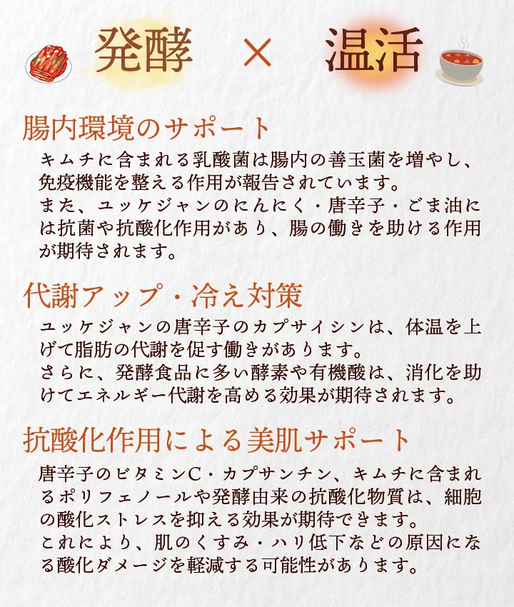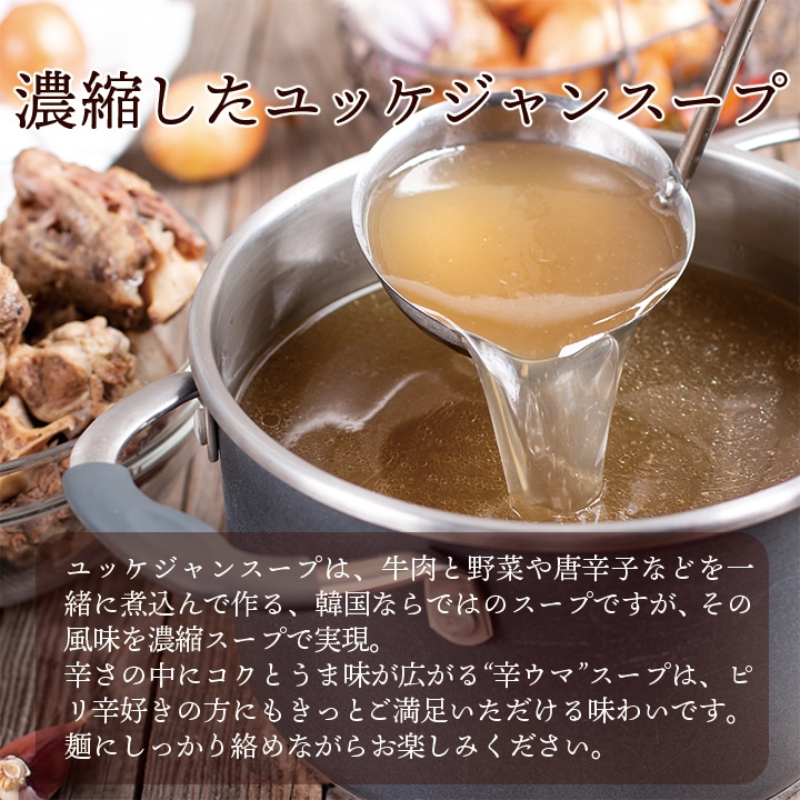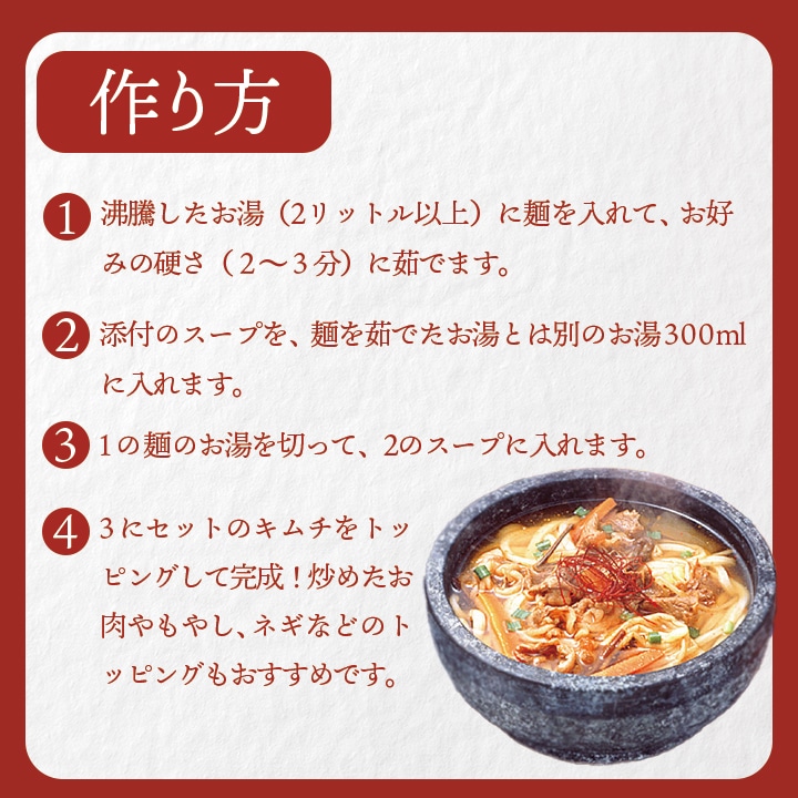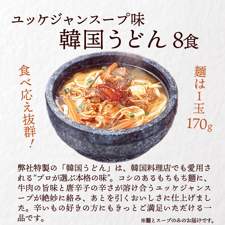 当店オリジナル開発品の韓国風ユッケジャン味のスープに、杵打ち風のコシのしっかりしたうどん麺、トッピングの白菜キムチをセットにしています。ラーメンでも冷麺でもない、韓国のあったかい麺料理をぜひ味わってみてください。 【商品内容】 ・韓国うどんユッケジャンスープ味8食(麺170g×8玉、濃縮スープ8袋) ※業務用なので簡易パッケージとなります。あらかじめご承知おき下さい。 ・白菜キムチ(株漬け・袋入) 500g 【原材料名】 ●麺:小麦粉(国内製造)、でん粉、食塩 / 酒精、加工でん粉 ●ユッケジャンスープ:しょうゆ(国内製造)、肉エキス、食塩、砂糖、ガーリック、動物油脂、ごま、植物油脂、豆板醤、ショートニング、唐辛子、酵母エキス / 調味料(アミノ酸等)、増粘剤(加工デンプン、キサンタン)、酒精、カラメル色素、パプリカ色素、香辛料抽出物、酸味料、香料、カロチン色素、(一部に小麦・ごま・大豆・鶏肉・豚肉を含む) ●白菜キムチ:白菜(国産)、ニラ(国産)、漬け原材料(りんご、唐辛子、アミエビ、砂糖、にんにく、生姜、鰹節、塩) / 調味料(アミノ酸) 【配送方法】冷蔵便