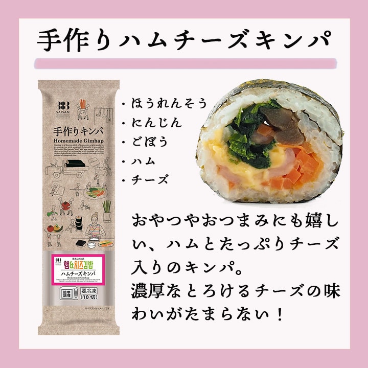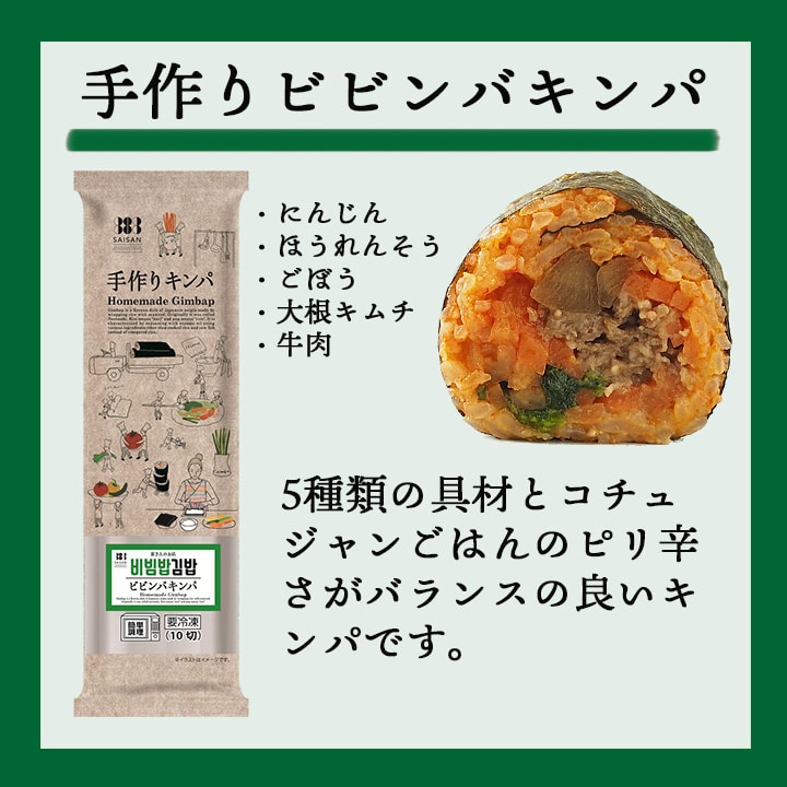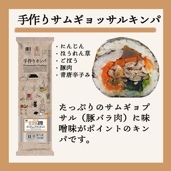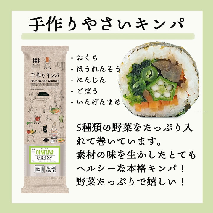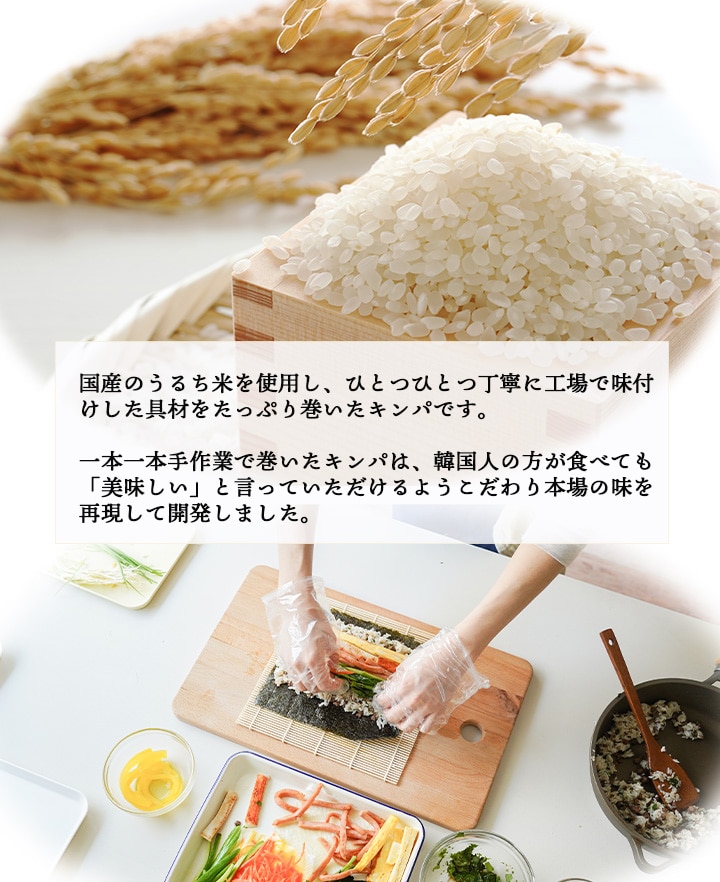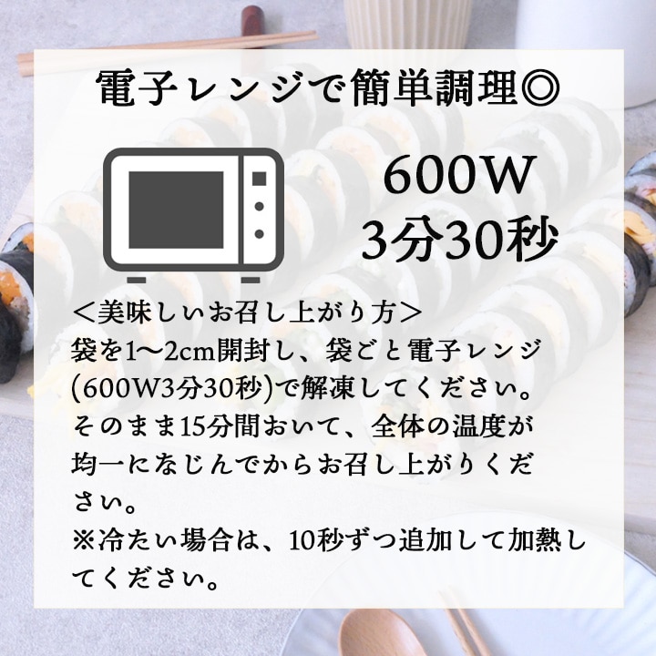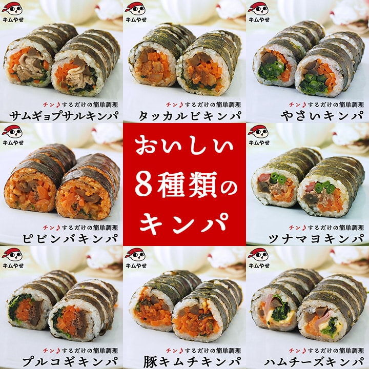 <美味しいお召し上がり方> 袋を1~2cm開封し、袋ごと電子レンジ(600W3分30秒)で解凍してください。 そのまま15分間おいて、全体の温度が均一になじんでから、お召し上がりください。 ※冷たい場合は、10秒ずつ追加して加熱してください。 【商品名】キンパ8種セット(プルコギ・豚キムチ・ツナマヨ・ハムチーズ・野菜・タッカルビ・サムギョプサル・ピビンパ) 【原材料名】 [プルコギ]:うるち米(国産)、野菜(人参(中国産)、ほうれんそう、ごぼう)、牛肉(輸入)、焼肉のたれ、食用ごま油、みりん、昆布、焼きのり、ごま、植物油脂、しょうゆ、食塩、砂糖、醸造調味料/調味料(アミノ酸等)、トレハロース、くん液、アルコール、カラメル色素、ソルビトール、増粘剤(キサンタン)、酸味料、香料、香辛料抽出物、V.B1、pH調整剤、(一部に小麦・牛肉・ごま・大豆・鶏肉・りんご・ゼラチンを含む) [豚キムチ]:うるち米(国産)、野菜(人参(中国産)、ほうれんそう、ごぼう)、キムチ(白菜、ニラ、その他)、豚肉(カナダ産)、食用ごま油、みりん、昆布、焼きのり、しょうゆ、ごま、植物油脂、食塩、砂糖、醸造調味料、粉末キムチの素/調味料(アミノ酸等)、トレハロース、アルコール、増粘多糖類、酸味料、pH調整剤、(一部にえび・小麦・乳成分・ごま・大豆・豚肉・りんごを含む) [ツナマヨ]:うるち米(国産)、野菜(人参(中国産)、いんげんまめ、ごぼう)、かつおサラダ油漬フレーク、かに風味かまぼこ、マヨネーズ、食用ごま油、昆布、みりん、焼きのり、しょうゆ、ごま、植物油脂、食塩、砂糖、醸造調味料/加工でん粉、調味料(アミノ酸等)、トレハロース、乳酸Na、着色料(紅麹)、香料、アルコール、香辛料抽出物、pH調整剤、(一部にかに・小麦・卵・乳成分・ごま・大豆を含む) [ハムチーズ]:野菜(ほうれんそう、(中国産)、人参、ごぼう)、うるち米(国産)、ロースハム、プロセスチーズ、食用ごま油、昆布、みりん、焼きのり、ごま、しょうゆ、植物油脂、食塩、砂糖、醸造調味料/乳化剤、調味料(アミノ酸等)、トレハロース、酸化防止剤(V.C)、着色料(カロテノイド、コチニール、クチナシ)、くん液、発色剤(亜硝酸Na)、アルコール、ゲル化剤(加工でん粉、増粘多糖類)、リン酸塩(Na)、レシチン、pH調整剤、(一部に小麦・卵・乳成分・ごま・大豆・豚肉・ゼラチンを含む) [野菜]:野菜(おくら(中国産)、ほうれんそう(中国産)、人参(中国産)、ごぼう(中国産)、いんげんまめ(中国産))、うるち米(国産)、食用ごま油、みりん、昆布、しょうゆ、焼きのり、砂糖、ごま、植物油脂、食塩、醸造調味料/調味料(アミノ酸等)、トレハロース、アルコール、pH調整剤、(一部に小麦・ごま・大豆を含む) [タッカルビ]:うるち米(国産)、野菜(人参(中国産)、ほうれんそう、ごぼう)、鶏肉(ブラジル産)、たれ、食用ごま油、コチュジャン、みりん、昆布、焼きのり、砂糖、ごま、植物油脂、しょうゆ、食塩、醸造調味料、塩コショウ、牛肉だしの素、酵母加工品、おろしにんにく、ガラムマサラ/ソルビトール、調味料(アミノ酸等)、トレハロース、酒精、酸味料、増粘剤(キサンタン)、V.B1、pH調整剤、香料、香辛料抽出物、くん液、アルコール、カラメル色素、(一部に小麦・乳成分・牛肉・ごま・大豆・鶏肉・りんご・ゼラチンを含む) [サムギョプサル]:うるち米(国産)、野菜(人参(中国産)、ほうれんそう、ごぼう)、豚肉(カナダ産)、青唐辛子みそ(みそ、砂糖、ねぎ、その他)、食用ごま油、みりん、昆布、焼きのり、植物油脂、ごま、しょうゆ、食塩、砂糖、塩コショウ、醸造調味料、ガーリックパウダー/調味料(アミノ酸等)、トレハロース、酸味料、酒精、増粘多糖類、アルコール、着色料(銅葉緑素)、香料、pH調整剤、(一部に小麦・ごま・大豆・豚肉を含む) [ピビンパ]:野菜(人参(中国産)、ほうれんそう(中国産)、ごぼう)、うるち米(国産)、割り干し大根キムチ、コチュジャン、牛肉、食用ごま油、みりん、たれ、昆布、焼きのり、しょうゆ、植物油脂、ごま、砂糖、食塩、醸造調味料/調味料(アミノ酸等)、ソルビトール、酒精、トレハロース、酸味料、甘味料(ステビア)、着色料(パプリカ色素、パプリカ粉末、カラメル)、増粘多糖類、保存料(ソルビン酸K)、V.B1、くん液、アルコール、香料、香辛料抽出物、pH調整剤、(一部に小麦・牛肉・ごま・大豆・鶏肉・りんご・ゼラチンを含む) 【内容量】 [プルコギ]:270g(1本10切) [豚キムチ]:275g(1本10切) [ツナマヨ]:282g(1本10切) [ハムチーズ]:275g(1本10切) [野菜]:282g(1本10切) [タッカルビ]:265g(1本10切) [サムギョプサル]:270g(1本10切) [ピビンパ]:265g(1本10切) 【賞味期限】30日以上保証 【保存方法】要冷凍(-18℃以下で保存) 【配送方法】冷凍便