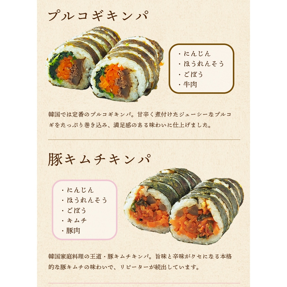 ◆韓国の人気メニューを一度に楽しめる、満足感たっぷりの贅沢セット。 忙しい毎日でも、温めるだけ・焼くだけで、簡単に“おうち韓国ごはん”が完成します! 夕食のメインにはもちろん、「忙しい日の時短ごはん」・「週末のご褒美ごはん」にもおすすめです♪ 「今日は何を作ろう…」と悩む日を減らしてくれる、“頼れる韓国グルメセット”をぜひお楽しみください! 【商品内容】 プルコギキンパ270g(1本10切)×1 豚キムチキンパ275g(1本10切)×1 タッカルビキンパ265g(1本10切)×1 ピビンパキンパ265g(1本10切)×1 サムギョプサルキンパ270g(1本10切)×1 チュクミポックム300g×1 オジンオポックム300g×1 スントゥブチゲ470g×1 イカ入りニラチヂミの素280g×1 トッポギ700g×1 チャプチェ300g×1 【原材料名】 プルコギキンパ:うるち米(国産)、野菜(人参(中国産)、ほうれんそう、ごぼう)、牛肉(輸入)、焼肉のたれ、食用ごま油、みりん、昆布、焼きのり、ごま、植物油脂、しょうゆ、食塩、砂糖、醸造調味料/調味料(アミノ酸等)、トレハロース、くん液、アルコール、カラメル色素、ソルビトール、増粘剤(キサンタン)、酸味料、香料、香辛料抽出物、V.B1、pH調整剤、(一部に小麦・牛肉・ごま・大豆・鶏肉・りんご・ゼラチンを含む) 豚キムチキンパ:うるち米(国産)、野菜(人参(中国産)、ほうれんそう、ごぼう)、キムチ(白菜、ニラ、その他)、豚肉(カナダ産)、食用ごま油、みりん、昆布、焼きのり、しょうゆ、ごま、植物油脂、食塩、砂糖、醸造調味料、粉末キムチの素/調味料(アミノ酸等)、トレハロース、アルコール、増粘多糖類、酸味料、pH調整剤、(一部にえび・小麦・乳成分・ごま・大豆・豚肉・りんごを含む) タッカルビキンパ:うるち米(国産)、野菜(人参(中国産)、ほうれんそう、ごぼう)、鶏肉(ブラジル産)、たれ、食用ごま油、コチュジャン、みりん、昆布、焼きのり、砂糖、ごま、植物油脂、しょうゆ、食塩、醸造調味料、塩コショウ、牛肉だしの素、酵母加工品、おろしにんにく、ガラムマサラ/ソルビトール、調味料(アミノ酸等)、トレハロース、酒精、酸味料、増粘剤(キサンタン)、V.B1、pH調整剤、香料、香辛料抽出物、くん液、アルコール、カラメル色素、(一部に小麦・乳成分・牛肉・ごま・大豆・鶏肉・りんご・ゼラチンを含む) ピビンパキンパ:野菜(人参(中国産)、ほうれんそう(中国産)、ごぼう)、うるち米(国産)、割り干し大根キムチ、コチュジャン、牛肉、食用ごま油、みりん、たれ、昆布、焼きのり、しょうゆ、植物油脂、ごま、砂糖、食塩、醸造調味料/調味料(アミノ酸等)、ソルビトール、酒精、トレハロース、酸味料、甘味料(ステビア)、着色料(パプリカ色素、パプリカ粉末、カラメル)、増粘多糖類、保存料(ソルビン酸K)、V.B1、くん液、アルコール、香料、香辛料抽出物、pH調整剤、(一部に小麦・牛肉・ごま・大豆・鶏肉・りんご・ゼラチンを含む) サムギョプサルキンパ:うるち米(国産)、野菜(人参(中国産)、ほうれんそう、ごぼう)、豚肉(カナダ産)、青唐辛子みそ(みそ、砂糖、ねぎ、その他)、食用ごま油、みりん、昆布、焼きのり、植物油脂、ごま、しょうゆ、食塩、砂糖、塩コショウ、醸造調味料、ガーリックパウダー/調味料(アミノ酸等)、トレハロース、酸味料、酒精、増粘多糖類、アルコール、着色料(銅葉緑素)、香料、pH調整剤、(一部に小麦・ごま・大豆・豚肉を含む) チュクミポックム:イイダコ(ベトナム産又はインドネシア産)、たれ【醤油、発酵調味料、香辛料、三温糖、にんにく、ごま油、魚醤、しょうが、すりごま、こんぶエキスパウダー、コーンスターチ、醸造酢、焼あごパウダー、かつお風味調味料、食塩/調味料(アミノ酸等)、(一部に大豆・小麦・ごまを含む) オジンオポックム:やりいか(インドネシア産)、たれ【醤油、発酵調味料、香辛料、三温糖、にんにく、ごま油、魚醤、しょうが、すりごま、こんぶエキスパウダー、コーンスターチ、醸造酢、焼あごパウダー、かつお風味調味料、食塩/調味料(アミノ酸等)、(一部に大豆・小麦・ごまを含む) スントゥブチゲ:アサリ(中国産)、ホタテ、むきエビ、コチュジャン、唐辛子、玉ねぎエキス、上新粉、牛風味調味料、塩、ごま油、醤油、ニンニク、風味調味料、こしょう / 調味料(アミノ酸等)、酸味料(一部にえび・小麦・乳成分・大豆・牛肉・ごまを含む) イカ入りニラチヂミの素:チヂミ粉(韓国製造)、いか、にら、人参、卵、ごま油、塩 / 増粘安定剤(グァーガム)、ベーキングパウダー、ビタミンB2、(一部に小麦・乳成分・卵・いか・ごまを含む) トッポギ:もち(国内製造)、コチュジャン、砂糖、米粉、トウモロコシ澱粉、牛風味調味料 / 調味料(アミノ酸等)、酸味料、(一部に小麦・乳成分・大豆・牛肉を含む) チャプチェ:春雨(韓国製造)、玉ねぎ(国産)、合い挽きミンチ、ごま油、ニンジン、ほうれん草、砂糖、牛風味調味料、干しシイタケ、醤油、塩、にんにく、酒、生姜、こしょう、リンゴ、唐辛子、発酵調味料 / 調味料(アミノ酸等)、酸味料、(一部