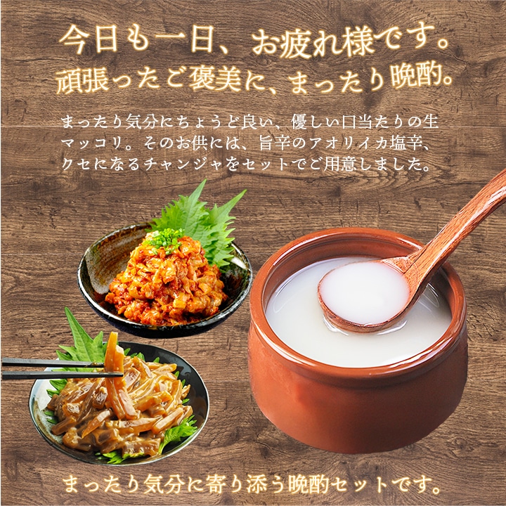アオリイカの旨みがぎゅっと詰まった塩辛、 ピリッとクセになるチャンジャ、 そこにやさしい口当たりの生マッコリをセットにしました。 今日はあれこれ考えず、 ちょっとずつつまみながら、ゆっくり飲みたい夜に。 “まったり”過ごす晩酌にちょうどいい組み合わせです。 【商品内容】青唐辛子入りのアオリイカ塩辛100g(袋入)、チャンジャ200g(袋入) 【原材料名】 ●アオリイカ塩辛:あおりいか、青唐辛子、いか肝臓、還元水飴、発酵調味料、醤油、たん白加水分解物、食塩、レモン果汁、砂糖、オイスターソース、昆布だし / 調味料(アミノ酸等)、酒精、酸味料、増粘多糖類、(一部に小麦・大豆・いかを含む) ●チャンジャ:タラの胃(ロシア産)、ニンニク、唐辛子、みりん、ごま油、風味調味料、醤油、鰹風味調味料、塩 / 調味料(アミノ酸)、(一部に小麦・大豆・ごまを含む) ●生マッコリ:米、麹、ブドウ糖/クエン酸、乳酸、甘味料(アスパルテーム・L-フェニルアラニン化合物)(一部に小麦を含む) 【品目】リキュール 【アルコール分】6度 【賞味期限】アオリイカ塩辛・チャンジャ:冷凍30日以上保証、生マッコリ:冷蔵30日以上保証 【保存方法】 アオリイカ塩辛・チャンジャ:要冷凍(-18℃以下) 生マッコリ:必ず冷蔵保管(10℃以下)してください。長時間、常温に放置すると品質変化の原因になります。 【配送方法】冷凍便