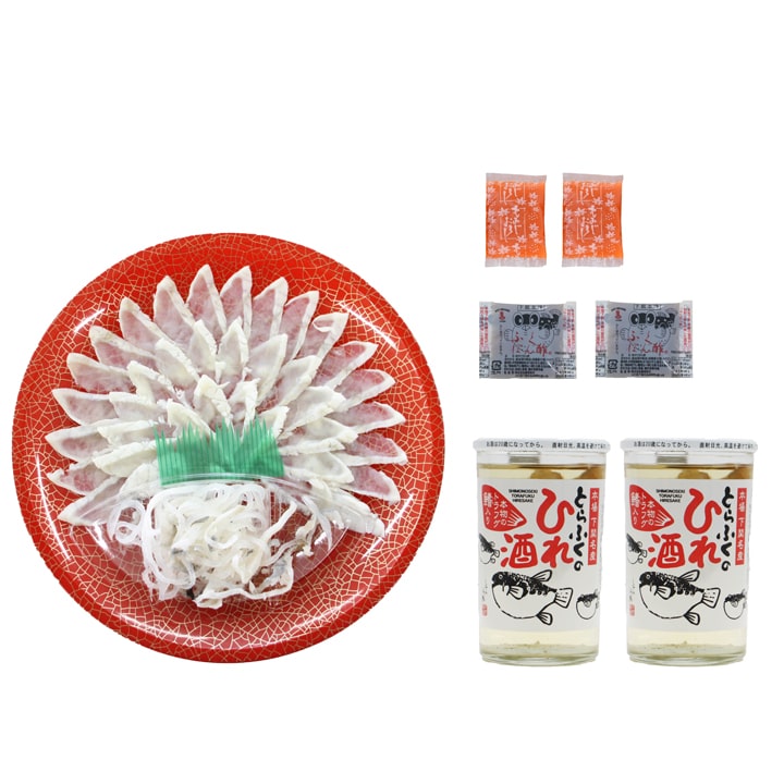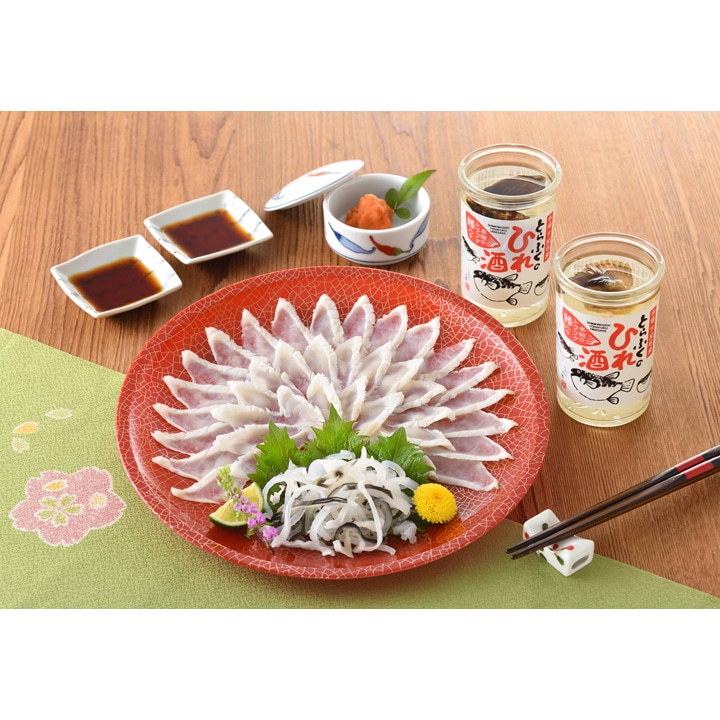 本場下関のふく引き職人が一枚一枚丁寧に盛り付けた「天然真ふく刺身」と、天然真ふく刺身の旨味をさらに引き立てる香ばしい香りが広がる本格「とらふくヒレ酒」のセットです。とらふくヒレ酒は、レンジで温めるだけですぐに飲め、心も体も温まる贅沢なひとときをお楽しみいただけます。 【商品内容】真ふぐ霜降り刺身(25cm皿)70g、とらふぐ皮30g、とらふぐヒレ酒180ml×2、ふくポン酢10g×2、もみじおろし10g×2 【原産地】マフグ(山口県産)、トラフグ(長崎県産、熊本県産:養殖)、大根(国産) 【アレルギー指定食品(28品目)】小麦・大豆 【賞味期限】冷凍90日 【保存方法】要冷凍(-18℃以下で保存) 【配送方法】冷凍便 ※こちらの商品はメーカー直送の為、他の商品とは同梱出来ません。 ※本商品にはアルコールが含まれています。 20歳未満の方の飲酒は法律で禁じられています。