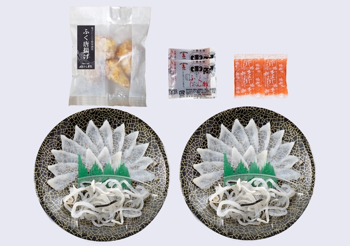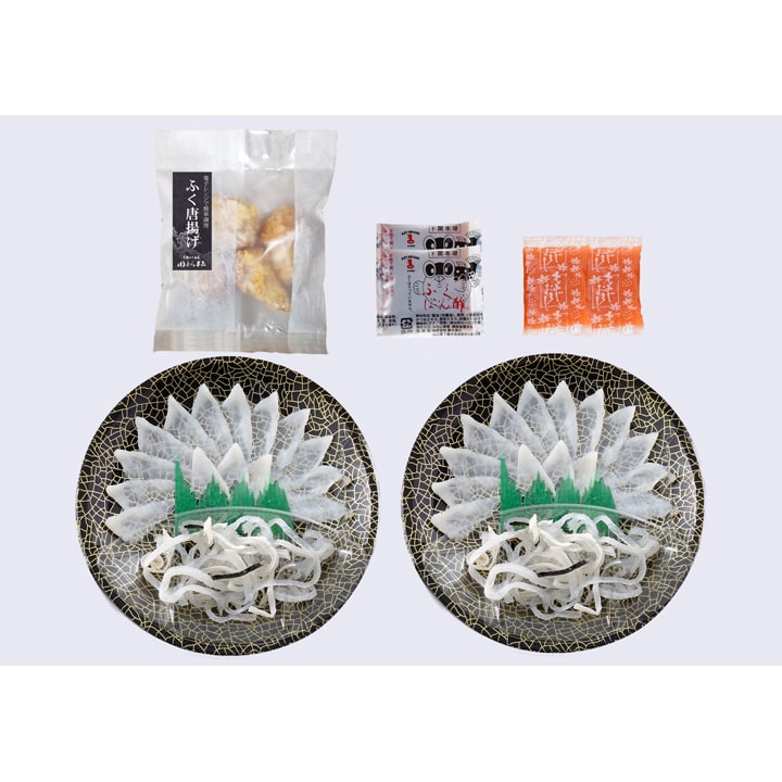 ふくの身を熱湯にサッとくぐらせた後、氷水に浸けることにより旨味を閉じ込める伝統技法「霜降造り」。霜降り加工した天然真ふく刺身と、ふく唐揚げのセットです。ふく唐揚げは油調理済ですので、電子レンジで簡単にお召し上がりいただけます。お刺身と唐揚げ、それぞれのふくの食感と旨味を食べ比べながらお楽しみください。 【商品内容】真ふぐ霜降り刺身(17cm皿)20g×2、とらふぐ皮20g×2、ふぐ唐揚げ(油調済・骨付)80g、ふくポン酢10g×2、もみじおろし10g×2 【原産地】マフグ(山口県産)、トラフグ(長崎県産、熊本県産:養殖)、シロサバフグ(福岡県産、長崎県産)、大根(国産) 【アレルギー指定食品(28品目)】小麦・大豆 【賞味期限】冷凍90日 【保存方法】要冷凍(-18℃以下で保存) 【配送方法】冷凍便 ※こちらの商品はメーカー直送の為、他の商品とは同梱出来ません。