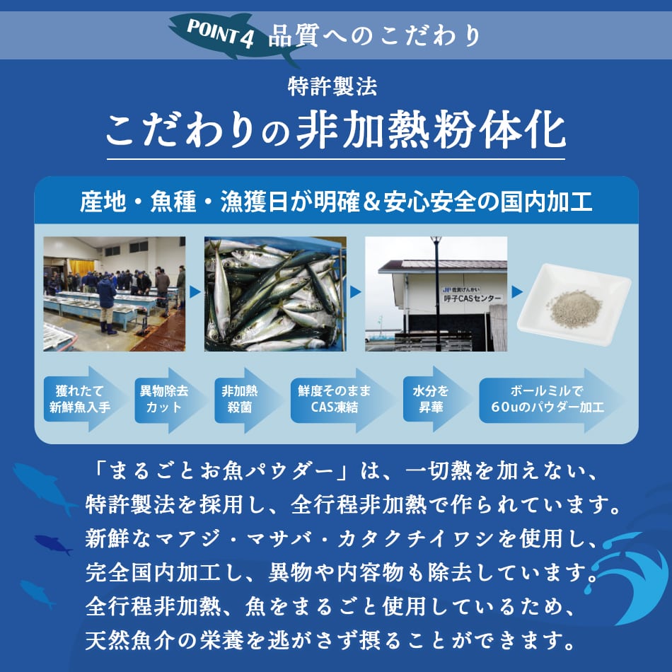 お魚の内臓やアラ、鱗や骨までまるごと食べられるパウダー。特許製法により、お魚まるごとの栄養がとれます。 【名称】アジ、サバ、イワシ乾燥粉末加工品 【原材料名】魚介類乾燥粉末(マアジ、マサバ、カタクチイワシ、香辛料)(国内製造)、還元麦芽糖水飴/環状オリゴ糖、酸化防止剤(ローズマリー抽出物、チャ抽出物、ビタミンE)、乳化剤 【内容量】45g(1.5g×30本) 【賞味期限】2025.12 【保存方法】直射日光、高温多湿を避け冷暗所で保存してください。 【配送方法】常温便
