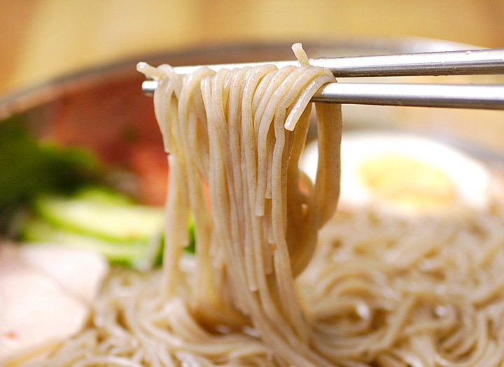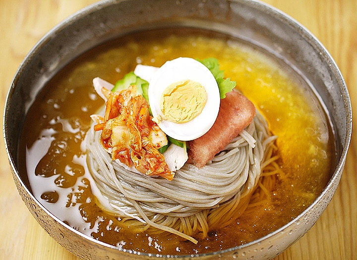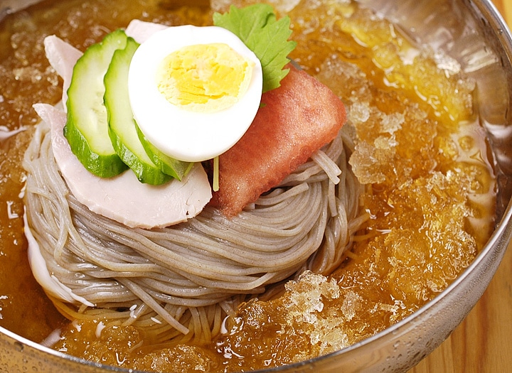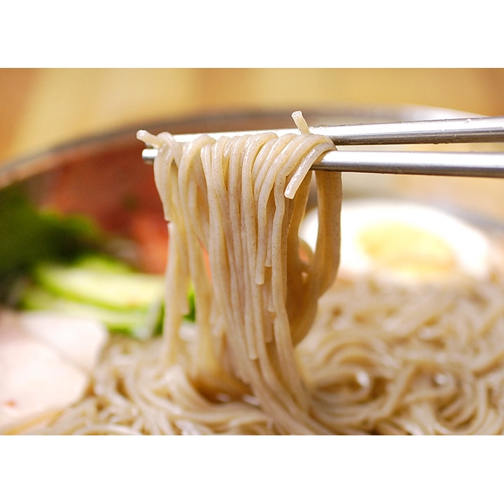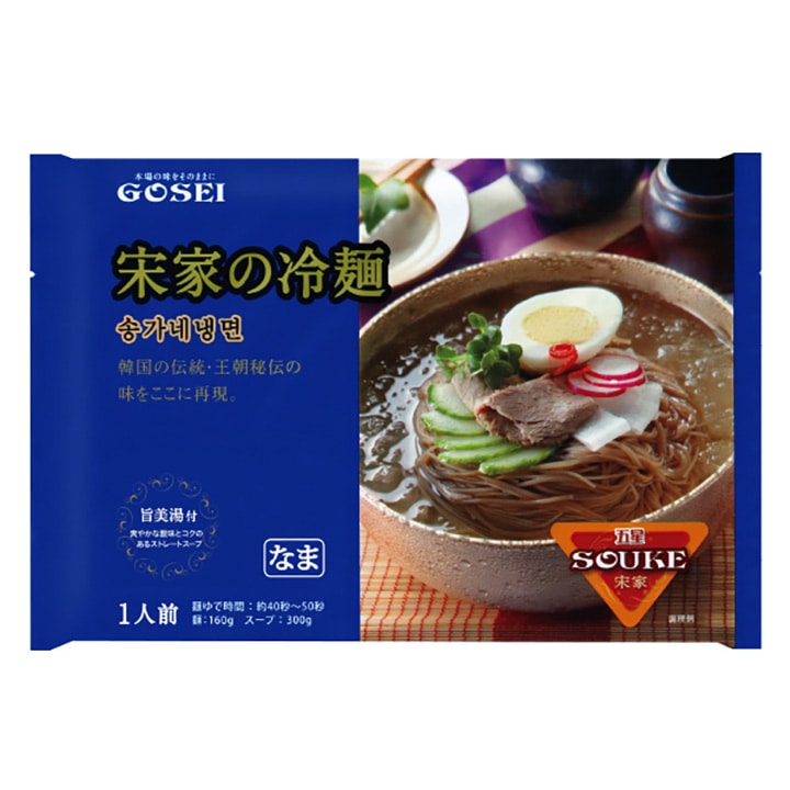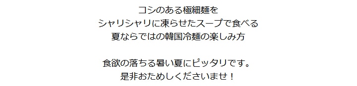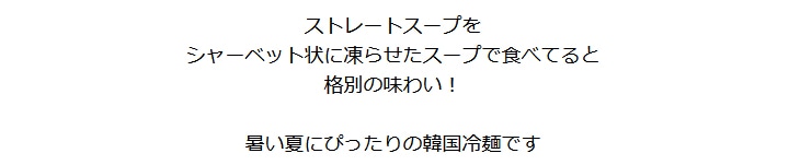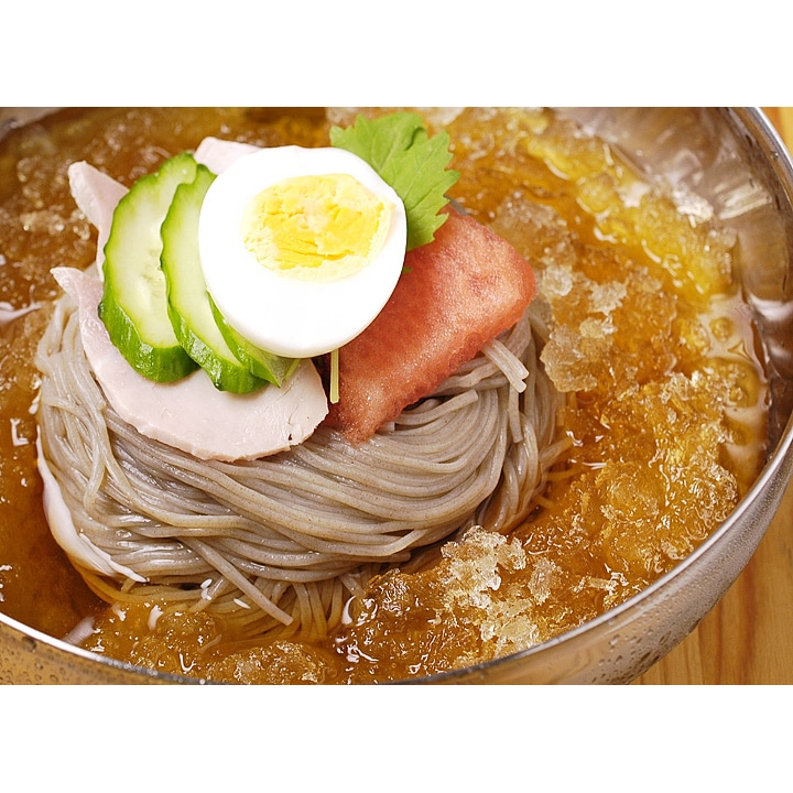 そば粉をした極細の麺と、牛ベースのコクとほど良い酸味が特長のストレートスープ。麺のゆで時間は45秒、スープもストレートタイプなので調理もとっても簡単です。お好みによりキムチ、梨、きゅうり、ゆで卵などを乗せてお召し上がりください。 【商品内容】冷麺1食460g(麺160g・スープ300g) 【原材料名】 ●麺:小麦粉、小麦でん粉、さつまいもでん粉、そば粉、食塩 / 酒精、かんすい、HPMC ●スープ:醸造酢、牛肉味粉末(小麦を含む)、砂糖、果糖、牛肉スープエキス(大豆・鶏肉を含む)、炭酸飲料、食塩、ビーフエキス / pH調整剤、調味料(アミノ酸等)、酸味料、V.B1、乳化剤、香料、増粘剤(キサンタンガム)、甘味料(ステビア)、アルギニン、香辛料抽出物、微粒二酸化ケイ素、V.E 【賞味期限】30日以上保証 【保存方法】直射日光を避け、冷暗所にて保存してください。 【配送方法】常温便