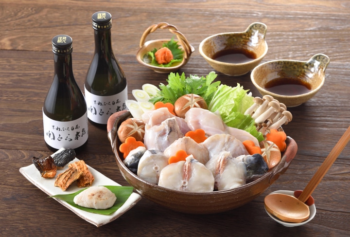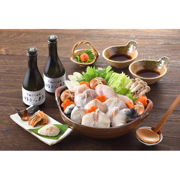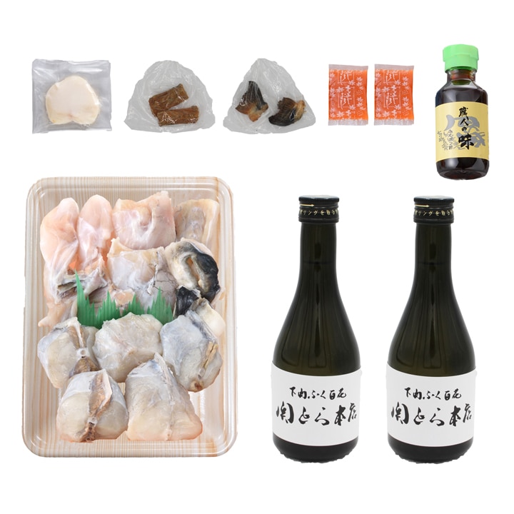 本場下関の職人が見極めたとらふくを豪快に捌いた「とらふくちり」。骨付きの身からあふれる旨みと、とらふくならではのぷりっとした食感をご堪能いただけます。冷酒でも熱燗でも美味しく楽しめる「関とら本店オリジナル吟醸酒」、関とら本店オリジナル吟醸酒は、冷やしても燗にしても、とらふくの旨みと絶妙に調和し、より一層その味わいを引き立てます。さらに、特別な「三福酒」を楽しむために、白子酒用の「とらふく焼き白子」、ヒレ酒用の「とらふく焼きヒレ」、そして骨酒用の「とらふく焼き骨」をセットしました。贅沢な「三福酒」をご堪能ください。 【商品内容】とらふぐちり(切身、アラ)300g、とらふぐ焼き白子20g、日本酒(関とら本店)300ml×2、ふくポン酢100ml、もみじおろし10g×2、とらふぐ焼き骨3g、とらふぐ焼きヒレ2枚 【原産地】トラフグ(長崎県産、熊本県産:養殖)、シロサバフグ(福岡県産、長崎県産)、大根(国産) 【アレルギー指定食品(28品目)】小麦・大豆 【賞味期限】冷凍90日 【保存方法】要冷凍(-18℃以下で保存) 【配送方法】冷凍便 ※こちらの商品はメーカー直送の為、他の商品とは同梱出来ません。 ※本商品にはアルコールが含まれています。 20歳未満の方の飲酒は法律で禁じられています。