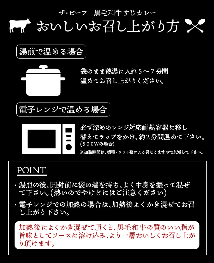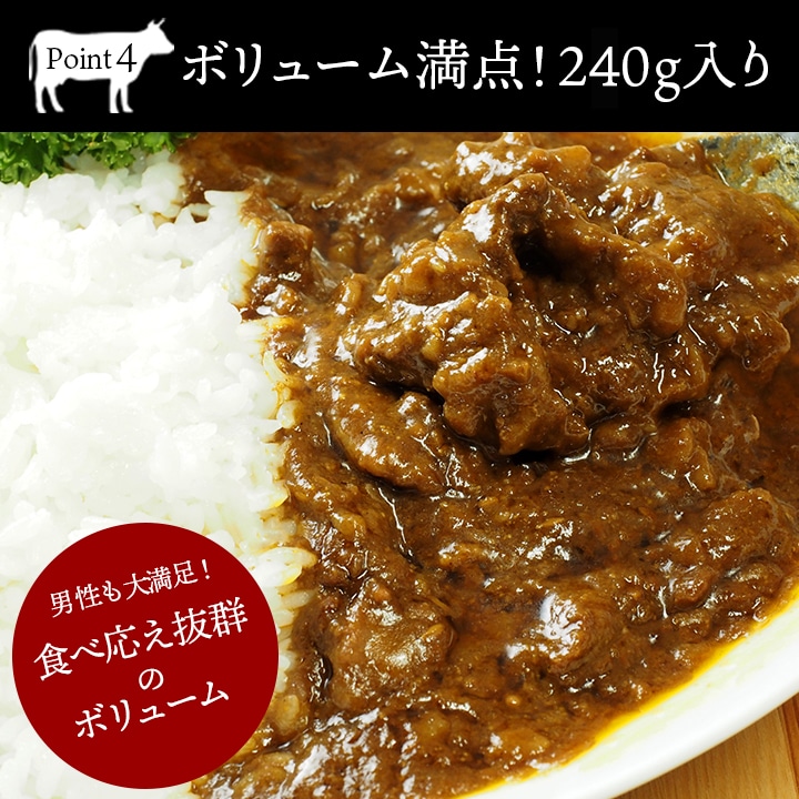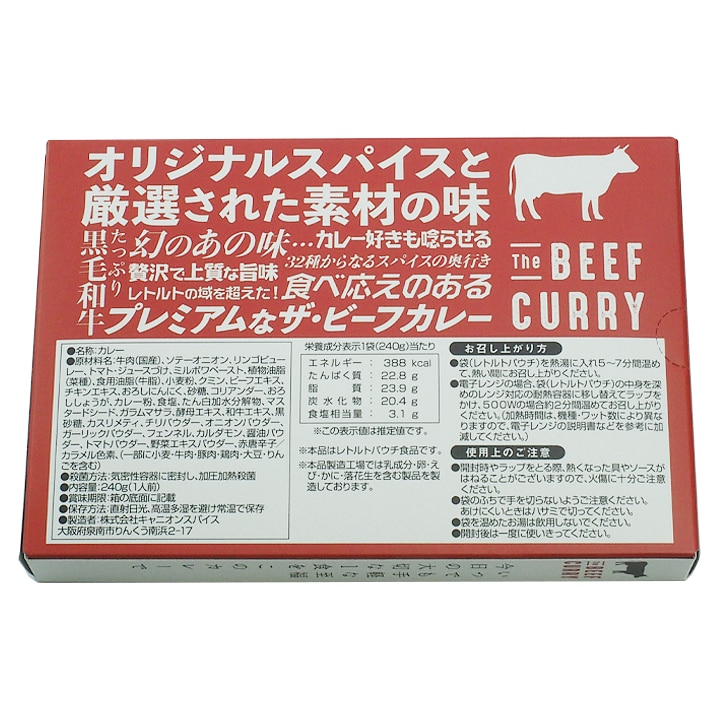 黒毛和牛すじ肉をたっぷり100g(生換算)使用した贅沢なカレー。口の中でとろけるほど柔らかい黒毛和牛の上質な美味しさと、厳選したこだわりの32種類のスパイスの風味が豊かに広がる、リッチな気分が味わえる期待を裏切らないカレーです。 男性にもご満足頂ける内容量240gとたっぷりサイズ!限定数量しか生産できないので今までは限られたイベントでしか購入できなかったのが、この度お客様の声にお応えし当店でも販売決定! レトルトの域を超えたおいしさとSNSでも話題になっており、自宅で専門店以上のカレーが味わえると大好評の商品です。 【商品内容】ザ・ビーフ黒毛和牛すじカレー 240g×3 【原材料名】牛肉(国産)、ソテーオニオン、リンゴピューレ、トマト・ジュースづけ、ミルポワペースト、植物油脂(菜種)、食用油脂(牛脂)、小麦粉、クミン、ビーフエキス、チキンエキス、おろしにんにく、砂糖、コリアンダー、おろししょうが、カレー粉、食塩、たん白加水分解物、マスタードシード、ガラムマサラ、酵母エキス、和牛エキス、黒砂糖、カスリメティ、チリパウダー、オニオンパウダー、ガーリックパウダー、フェンネル、カルダモン、醤油パウダー、トマトパウダー、野菜エキスパウダー、赤唐辛子/カラメル色素、(一部に小麦・牛乳・豚肉・鶏肉・大豆・りんごを含む) 【賞味期限】60日以上保証 【保存方法】直射日光を避け、冷暗所にて保存してください。 【配送方法】常温便