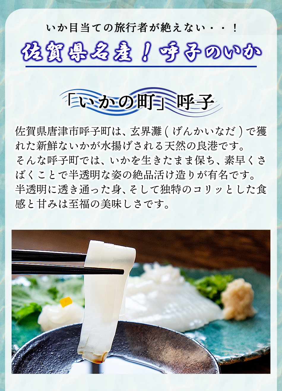 年間を通して大勢の観光客が訪れる「いか活造り」で有名な佐賀県唐津市呼子町。 そんな呼子町は、いか目当ての旅行者が絶えないと言われています。 呼子のいかは、日本中の美食家に愛される逸品。佐賀県呼子町の透き通った海で育ったいかは、その新鮮さと綺麗な半透明の身、いか本来の甘みの濃厚さで知られています。 そんな呼子のいかを鮮度抜群!美味しさそのままで、ご自宅までお届けします! 漁師さんが一本釣りした呼子産の剣先いかの活き造りを、新鮮なうちに職人が丁寧に活造りに仕上げ、魚本来の「旨味・香り・みずみずしさ」を保てる最新のCAS凍結で瞬間凍結いたしました。 CAS凍結は食品の水分を、過冷却(液体を静かに冷やすと凝固点以下でも凍らない)状態にし、一気に凍らせることにより、食材の中にできる氷結晶を最小限に抑え、細胞膜を傷つけることなく、本来の美味しさを保ち凍らせることができる技術です。 そんなCAS凍結だからこそ、鮮度抜群!旨みたっぷりの「いか活造り」をご家庭でお召し上がりいただけます。 冷凍保存で、お召し上がりの際は袋のまま、水道水で10~15分流水で解凍するだけ!手軽に美味しい呼子のいかをお楽しみいただけます♪ 【商品内容】剣先イカ(天然) 約100~150g(1個あたり) 【産地】佐賀県呼子産 【賞味期限】冷凍30日以上保証 【保存方法】要冷凍(-18℃以下) 【配送方法】冷凍便