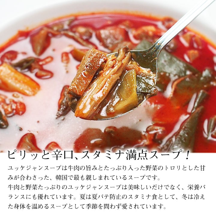 お肉がしっかり入った辛口の本格ユッケジャンスープです。牛肉、ねぎ、さつまいものつる、平茸などが入った具だくさんの内容で、辛いけど旨さもバツグンです。袋のまま湯煎や電子レンジで温めるだけで、簡単に美味しくお召し上がりいただけます。常温で保存できるので、うれしいポイントです。 【商品内容】辛口ビーフユッケジャン1kg 【原材料名】ねぎ、牛肉、さつまいものつる、唐辛子混合薬味(牛肉・ごま)、平茸、牛風味調味料(乳・牛肉・大豆)、唐辛子、牛脂、にんにく、醤油(小麦・大豆)、生姜、胡椒/調味料(核酸等) 【賞味期限】30日以上保証 【保存方法】直射日光、湿気を避け、涼しい場所に保存してください。 【原産国】大韓民国 【栄養成分表示(100gあたり)】エネルギー 48kcal、たんぱく質 5.8g、脂質 1.5g、炭水化物 2.9g、食塩相当量 0.6g この表示値は、目安です。 【配送方法】常温便