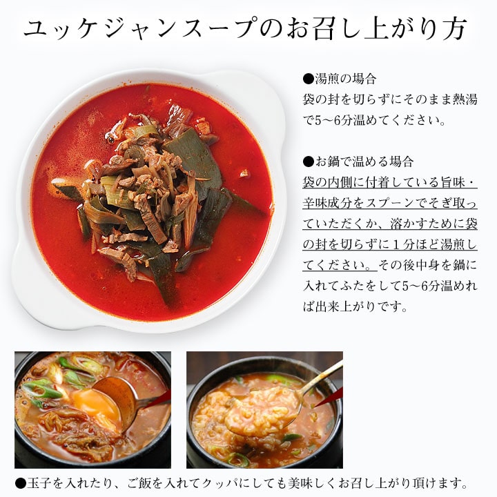お肉がしっかり入った辛口の本格ユッケジャンスープです。牛肉、ねぎ、さつまいものつる、平茸などが入った具だくさんの内容で、辛いけど旨さもバツグンです。袋のまま湯煎や電子レンジで温めるだけで、簡単に美味しくお召し上がりいただけます。常温で保存できるので、うれしいポイントです。 【商品内容】辛口ビーフユッケジャン1kg×2袋 【原材料名】ねぎ、牛肉、さつまいものつる、唐辛子混合薬味(牛肉・ごま)、平茸、牛風味調味料(乳・牛肉・大豆)、唐辛子、牛脂、にんにく、醤油(小麦・大豆)、生姜、胡椒/調味料(核酸等) 【賞味期限】30日以上保証 【保存方法】直射日光、湿気を避け、涼しい場所に保存してください。 【原産国】大韓民国 【栄養成分表示(100gあたり)】エネルギー 48kcal、たんぱく質 5.8g、脂質 1.5g、炭水化物 2.9g、食塩相当量 0.6g この表示値は、目安です。 【配送方法】常温便