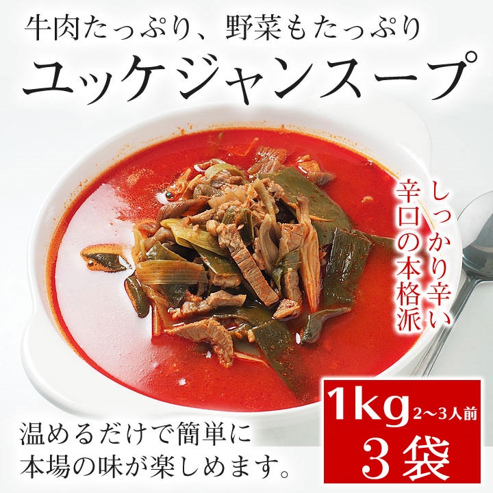 お肉がしっかり入った辛口の本格ユッケジャンスープです。牛肉、ねぎ、さつまいものつる、平茸などが入った具だくさんの内容で、辛いけど旨さもバツグンです。袋のまま湯煎や電子レンジで温めるだけで、簡単に美味しくお召し上がりいただけます。常温で保存できるので、うれしいポイントです。 【商品内容】辛口ビーフユッケジャン1kg×3袋 【原材料名】ねぎ、牛肉、さつまいものつる、唐辛子混合薬味(牛肉・ごま)、平茸、牛風味調味料(乳・牛肉・大豆)、唐辛子、牛脂、にんにく、醤油(小麦・大豆)、生姜、胡椒/調味料(核酸等) 【賞味期限】30日以上保証 【保存方法】直射日光、湿気を避け、涼しい場所に保存してください。 【原産国】大韓民国 【栄養成分表示(100gあたり)】エネルギー 48kcal、たんぱく質 5.8g、脂質 1.5g、炭水化物 2.9g、食塩相当量 0.6g この表示値は、目安です。 【配送方法】常温便