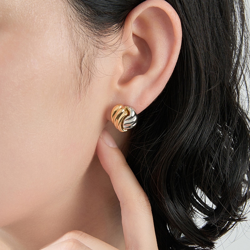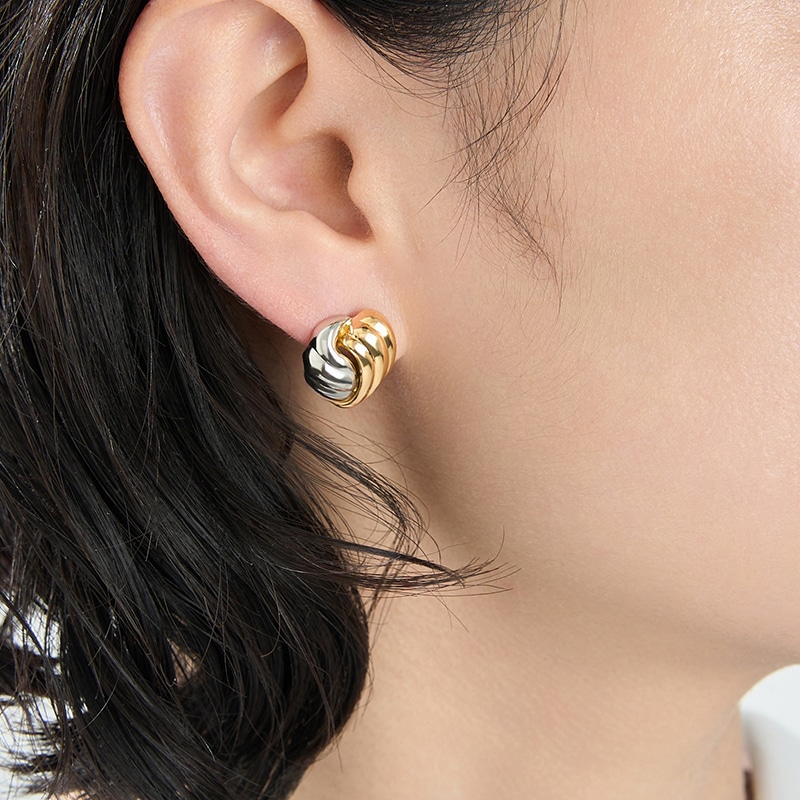 K18イエローゴールドとプラチナのコンビピアスです。ぷっくりとしたフォルムが特徴、イエローゴールドとプラチナが存在感のあるデザインです。 2色のコントラストが美しく耳元を華やかに彩ります。 着用しやすい樹脂キャッチが付いたカジュアルにもフォーマルにも着用できるスタッドタイプのピアスです。