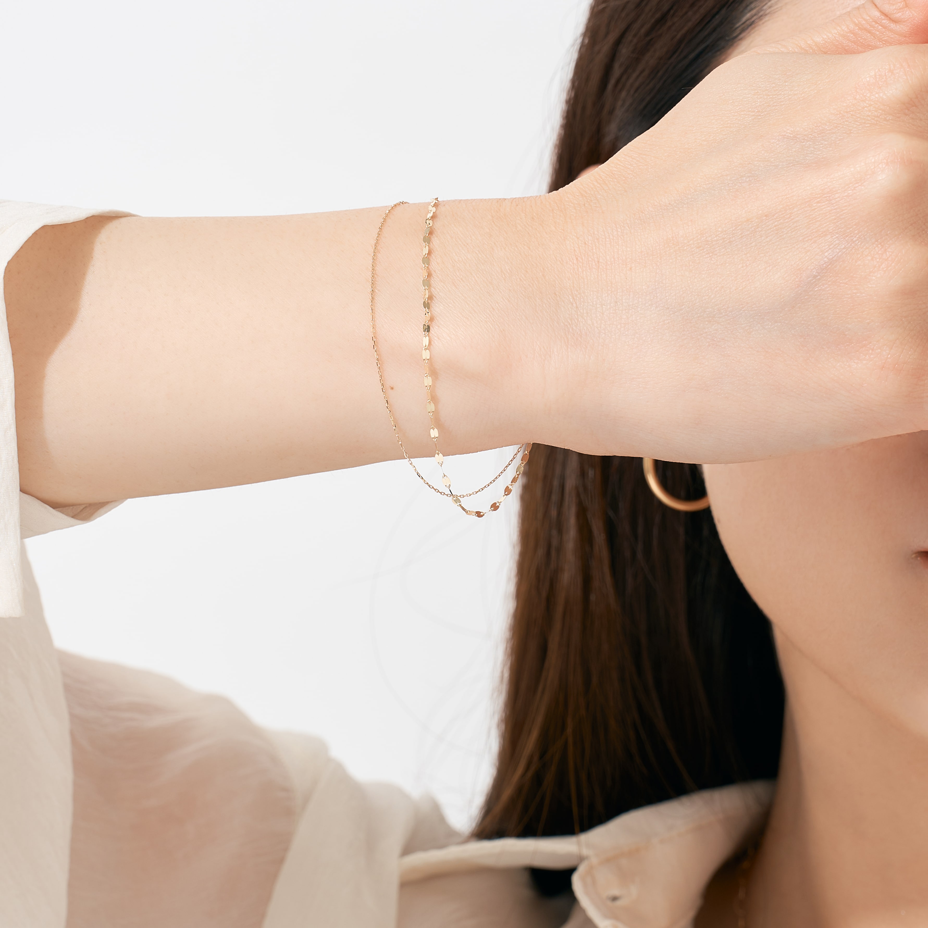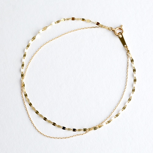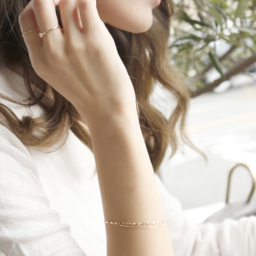 煌びやかなチェーンは、細めのチェーンと2連にすることで程よいカジュアル感をプラスした、使い勝手のいいデザインブレスです。 柔らかく手首に寄り添う素材とデザインだから、袖の隙間から調度良くのぞかせても、お洋服の上から付けても手元美人な印象に☆ 腕のラインを美しく見せる繊細さなので、キレイめファッションにもフォーマルなシーンでの装いでも、女性らしい上品さを演出してくれるアイテムです。 また、一本でも十分な存在感ですが、バングルや時計との相性もピッタリ◎ お手持ちのジュエリーに合わせても、調和して馴染むミニマルデザインも魅力の一つです。 宝石を使わないのにこんなにも美しく輝きを放つ地金の繊細さにあなたもきっと圧倒されます…☆