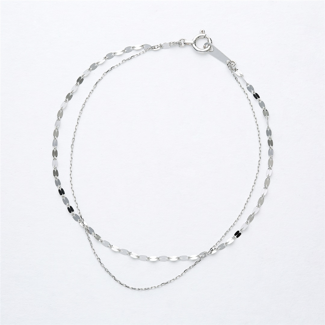 煌びやかなチェーンは、細めのチェーンと2連にすることで程よいカジュアル感をプラスした、使い勝手のいいデザインブレスです。 柔らかく手首に寄り添う素材とデザインだから、袖の隙間から調度良くのぞかせても、お洋服の上から付けても手元美人な印象に☆ 腕のラインを美しく見せる繊細さなので、キレイめファッションにもフォーマルなシーンでの装いでも、女性らしい上品さを演出してくれるアイテムです。 また、一本でも十分な存在感ですが、バングルや時計との相性もピッタリ◎ お手持ちのジュエリーに合わせても、調和して馴染むミニマルデザインも魅力の一つです。 宝石を使わないのにこんなにも美しく輝きを放つ地金の繊細さにあなたもきっと圧倒されます…☆