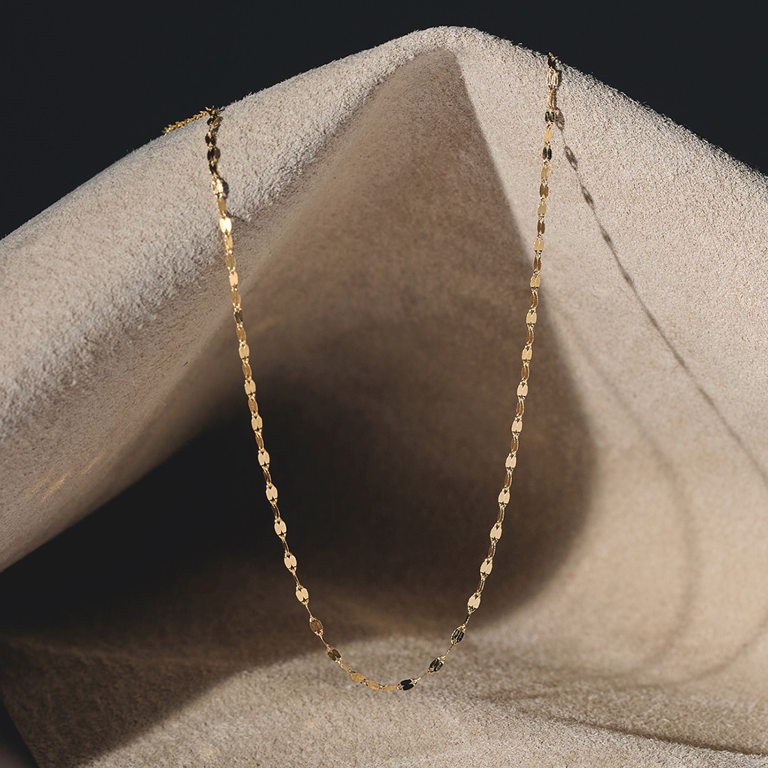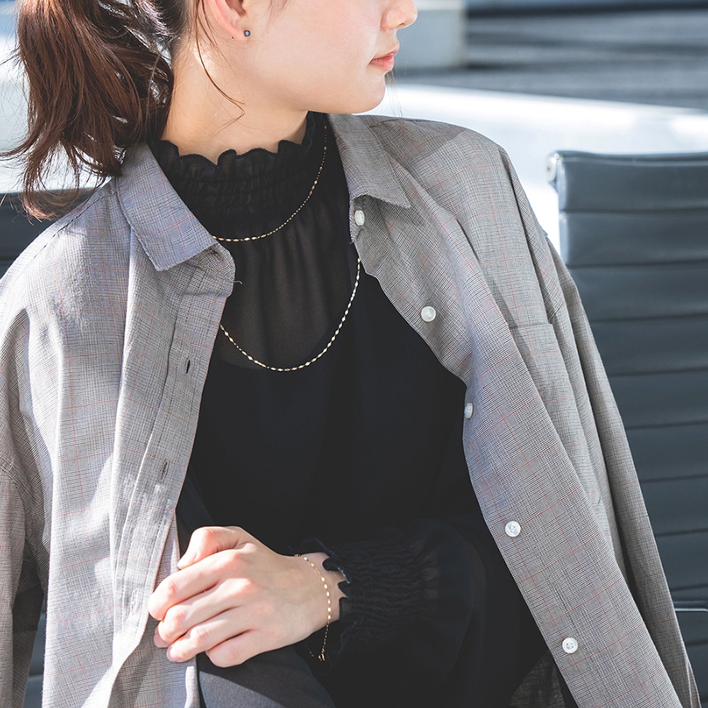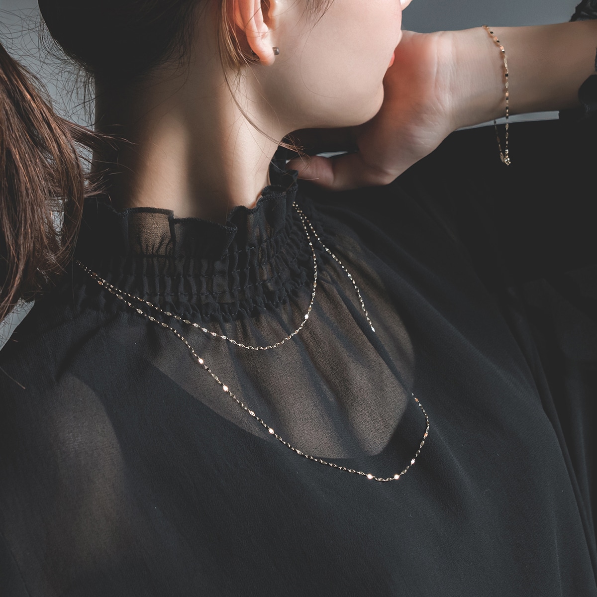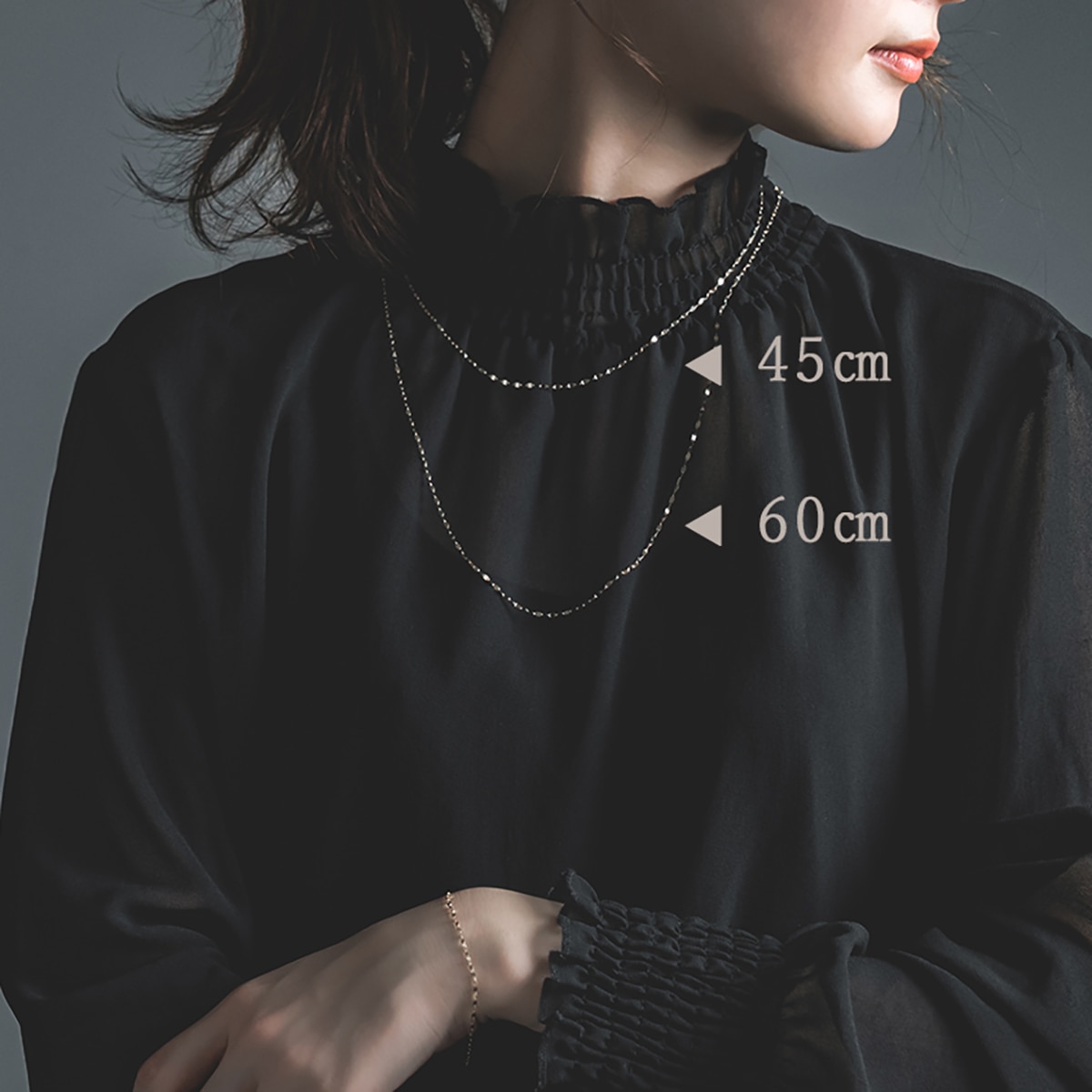 光を反射してキラキラと輝く繊細なチェーンネックレス。 旬な装いに仕上げてくれる万能アイテムです。 全長60cm仕様は胸元までのロングサイズ。 シンプルなお洋服に合わせると、コーディネートがぐっと華やかに。 一本でも十分な存在感ですが、他のネックレスとの重ね付けにもおすすめです。 ▽短めの全長45cm仕様は、関連アイテムからご購入いただけます。