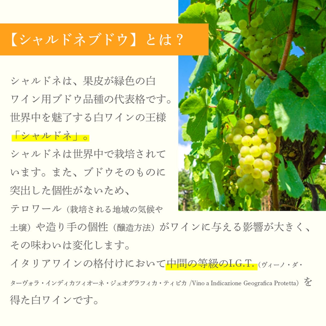 海抜600メートルの火山灰土壌の地域で栽培されたシャルドネ。大樽で約12か月間熟成させてからステンレスタンクで6か月間休ませてからボトリングされた白ワインです。