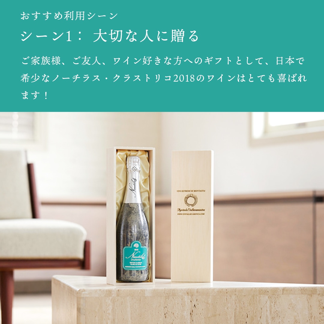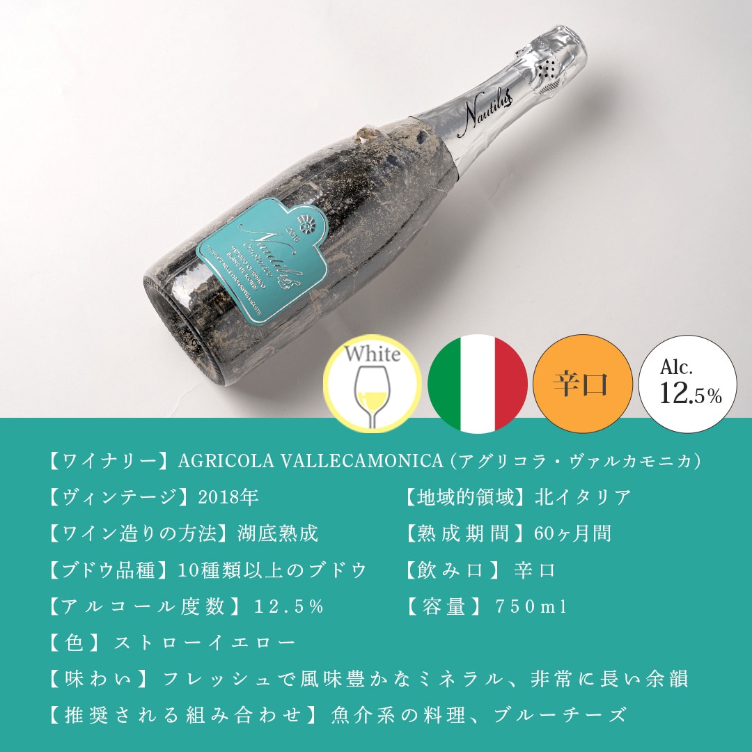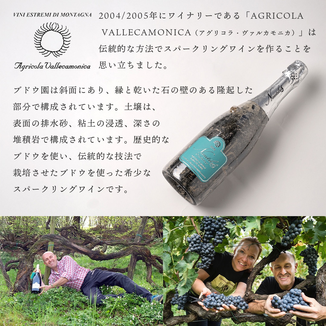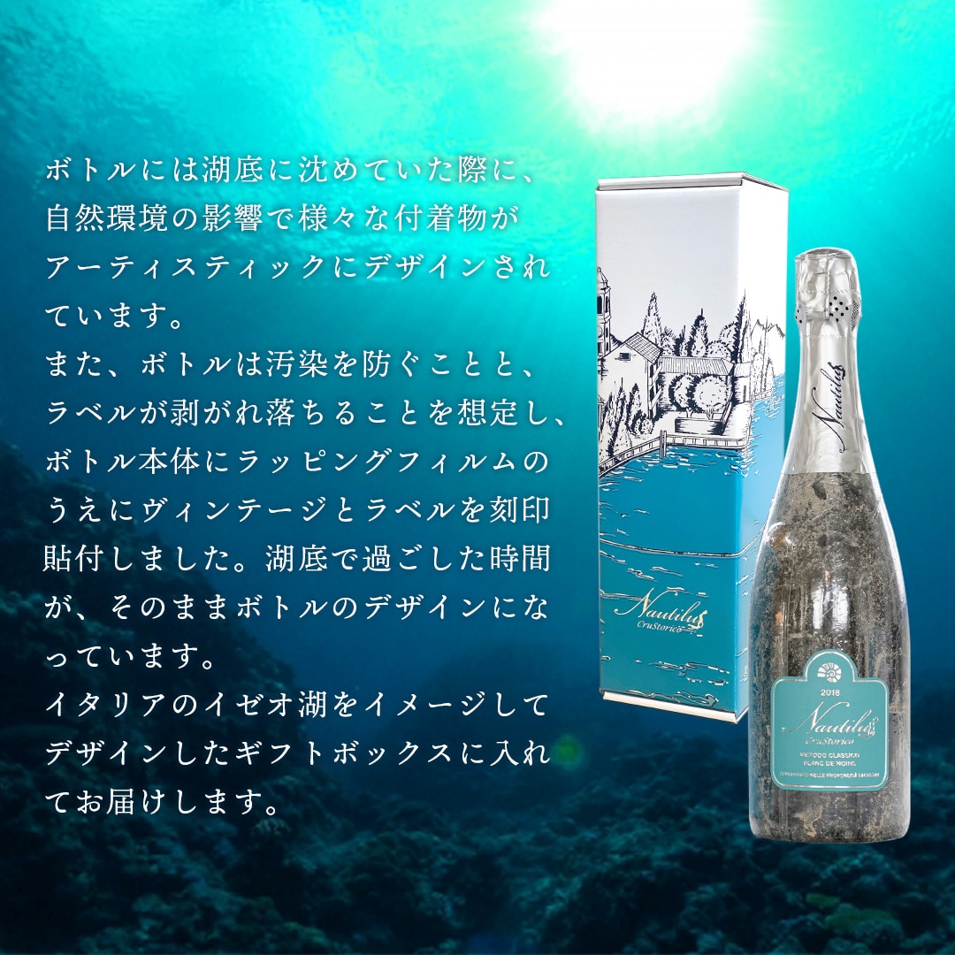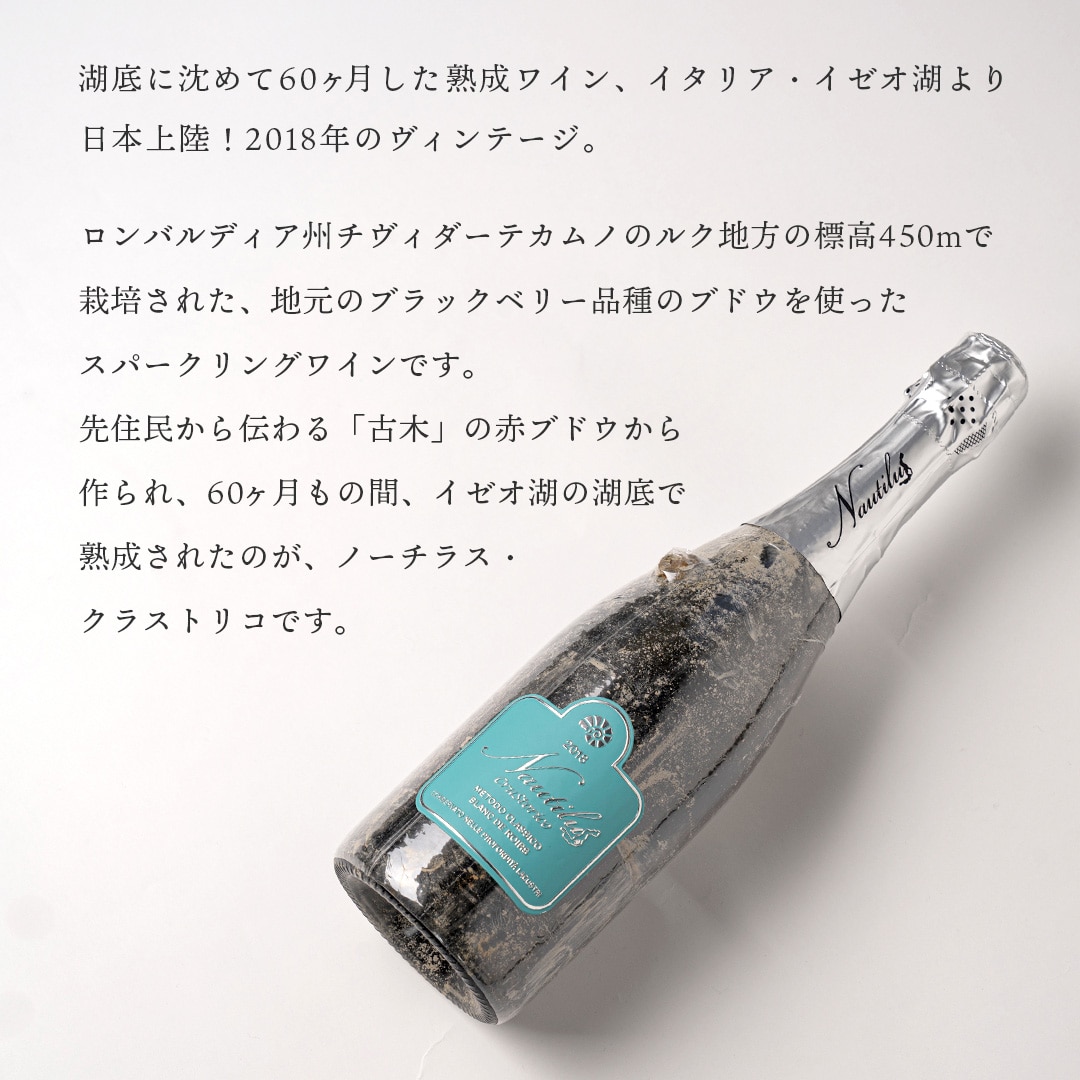 | 先住民から伝わる「古木」の赤ブドウから作られ、60ヶ月もの間イタリア・イゼオ湖の湖底で熟成された珍しいスパークリングワインです。 |