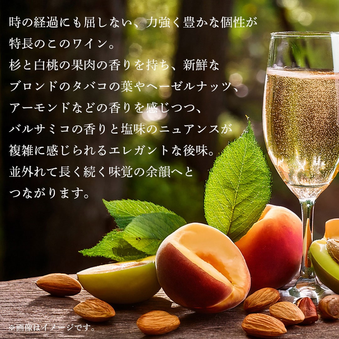 杉と白桃の果肉の香りを持ち、新鮮なブロンドのタバコの葉やヘーゼルナッツ、アーモンドなどの香りを感じつつ、バルサミコの香りと塩味のニュアンスが複雑に感じられるエレガントな後味。並外れて長く続く味覚の余韻へとつながります。