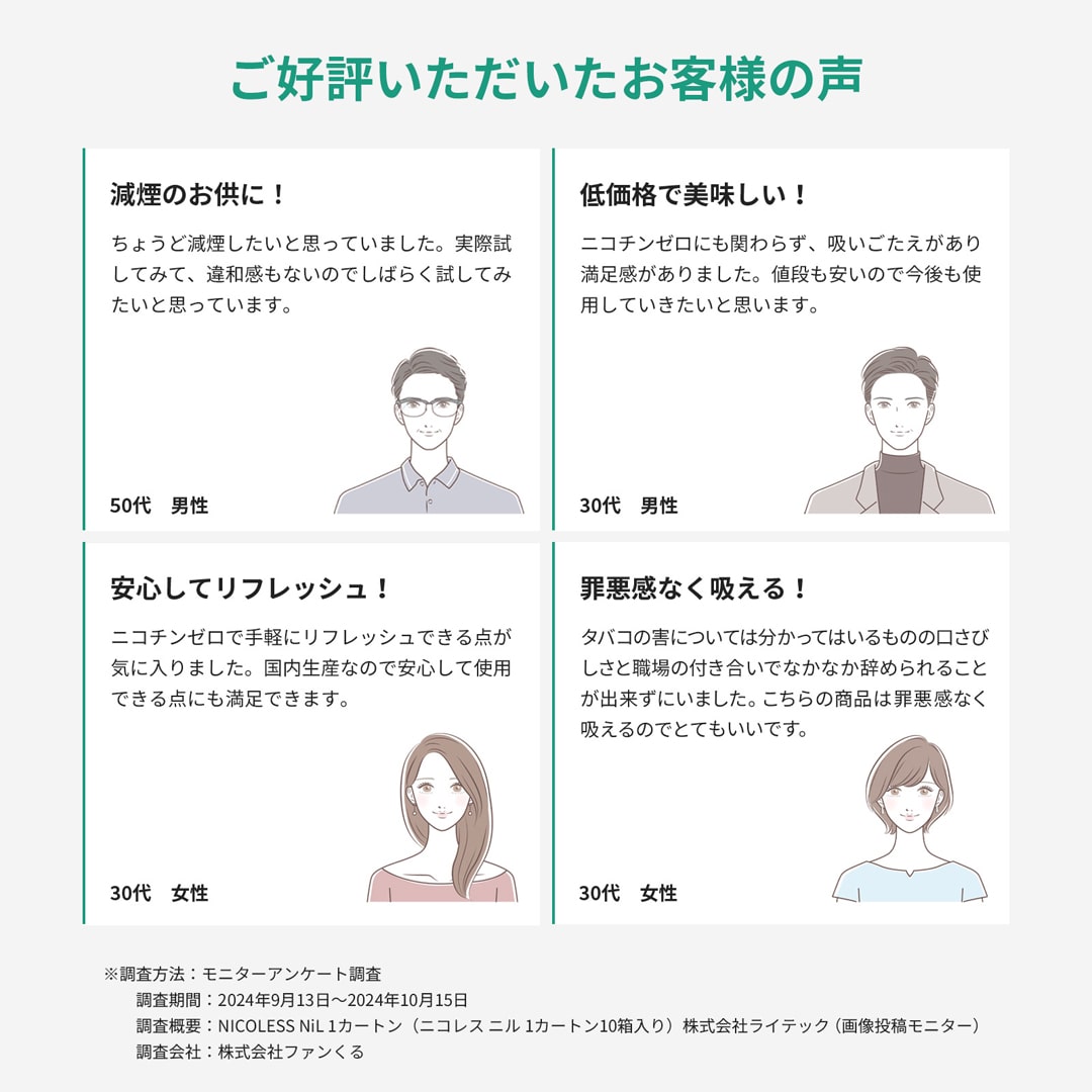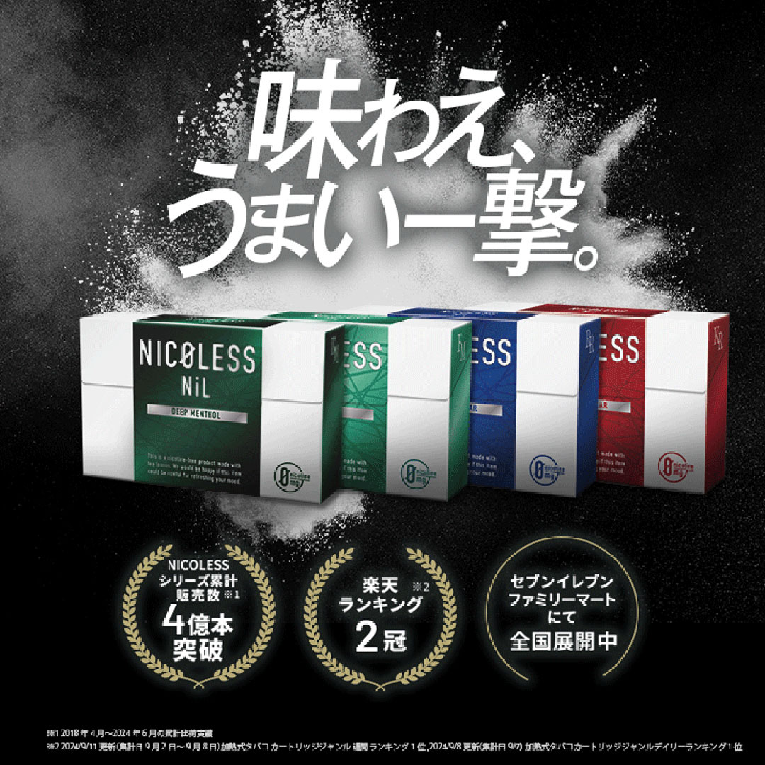NICOLESSはタバコ葉の代わりに中国福建省の上質な茶葉を使用したニコチンゼロのリフレッシュアイテム。周囲の方にも配慮しながら満足な吸い応えを実感できます。