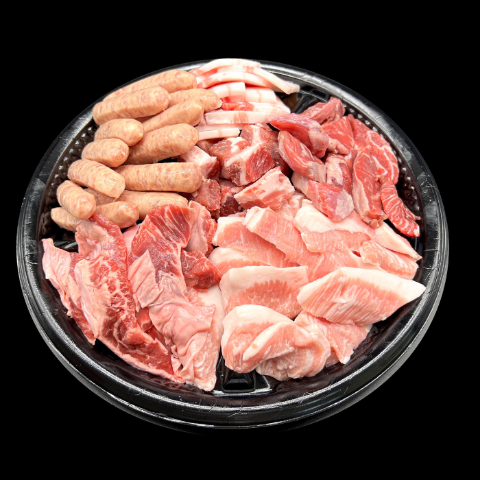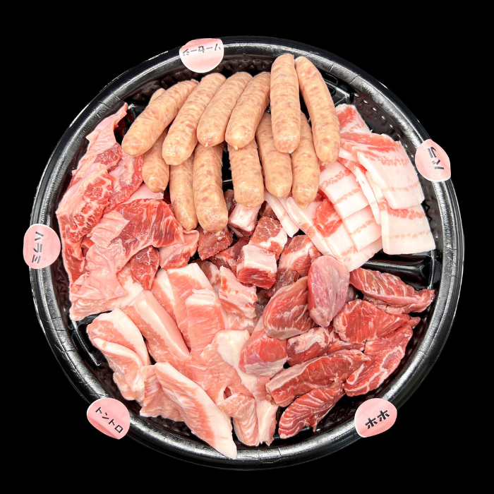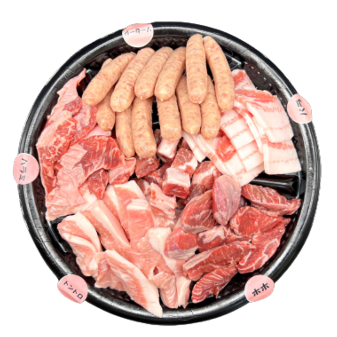 | 内容量 | バラ150g,肩ロース150g,ハラミ150g,ホホ150g,トントロ150g,ソーセージ20g×12本 |