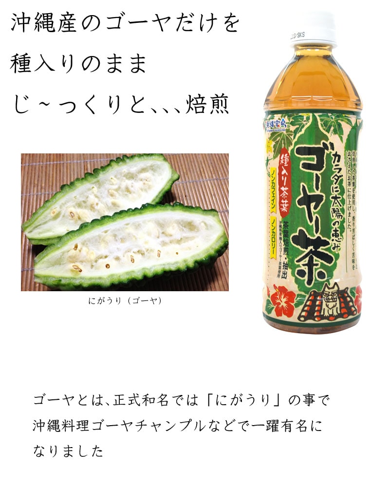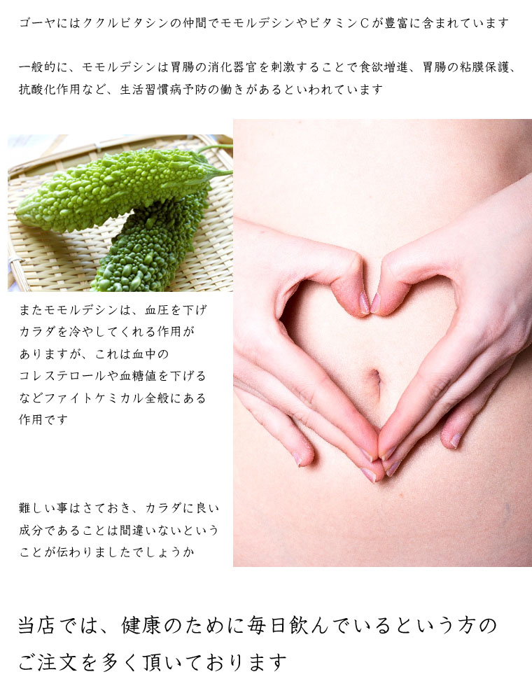 沖縄の夏野菜の代表 『ゴーヤー』 苦味成分としてのモモルデシンをはじめ、ビタミンCを多く含むことから、夏バテに効く健康野菜やダイエット食品としての認知度が高いことで有名です。 このゴーヤーを種ごと焙煎し香り芳ばしく苦味をおさえ飲みやすいお茶に仕上げました。 ゴーヤ茶に含まれるゴーヤの風味をたっぷりとお楽しみくださいませ
