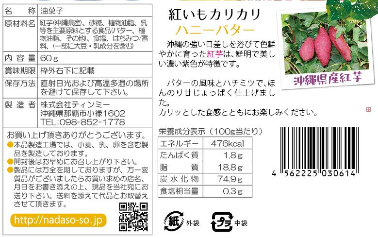 | 原材料 | 紅芋、砂糖、植物油脂、食塩、バター、ナチュラルチーズ、バターオイル、ハチミツ、香料 |