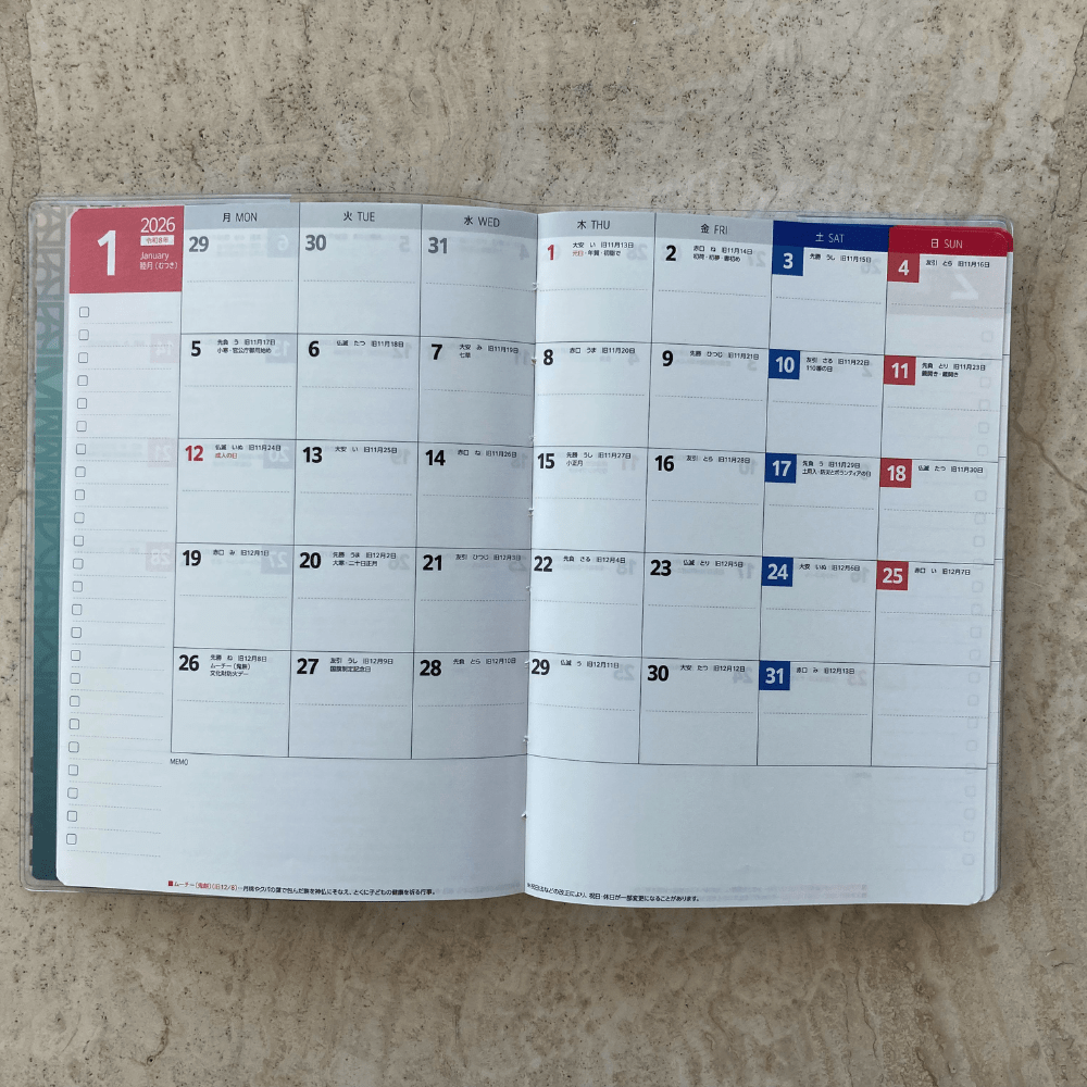 月間ブロック、1週間の予定、メモ記載ページがあり使い勝手が最高です。