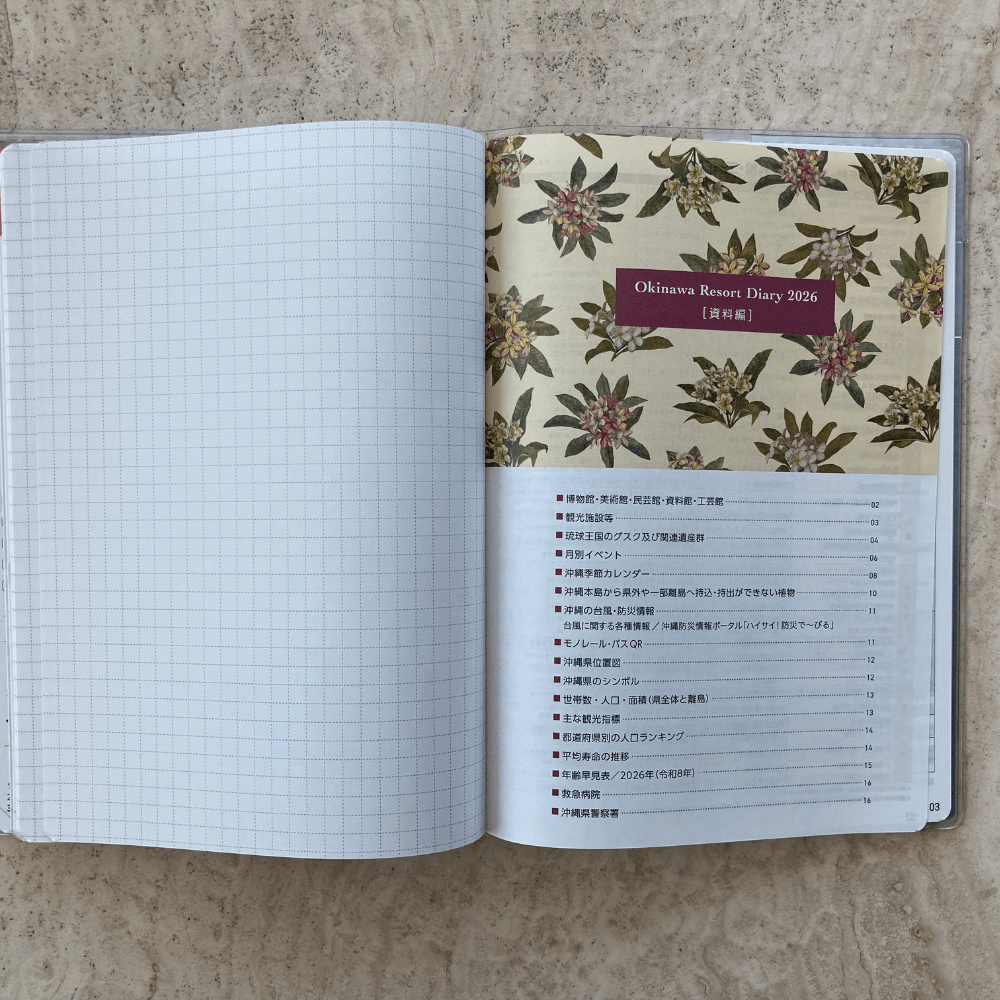 毎年、表紙のデザインが人気の沖縄リゾートダイアリーです。 観光情報や、沖縄県の基礎知識等、情報もりだくさん。 月間ブロック、1週間の予定、メモ記載ページがあり使い勝手が最高です。