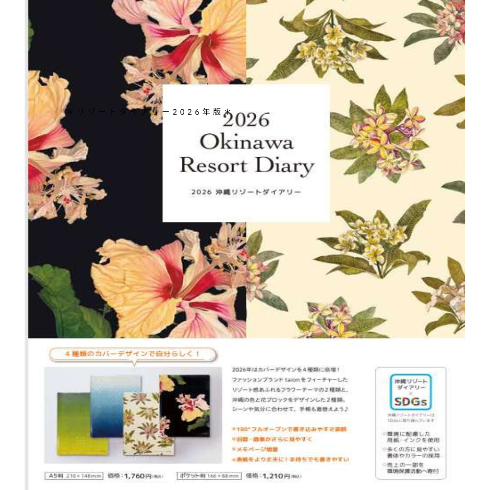 ファッションブランド taion(タイオン)をフィーチャーしたリゾート感あふれるフラワーテーマの2種類と、沖縄の色と花ブロックをデザインした2種類です。 シーンや気分に合わせて、手帳も着替えよう♪