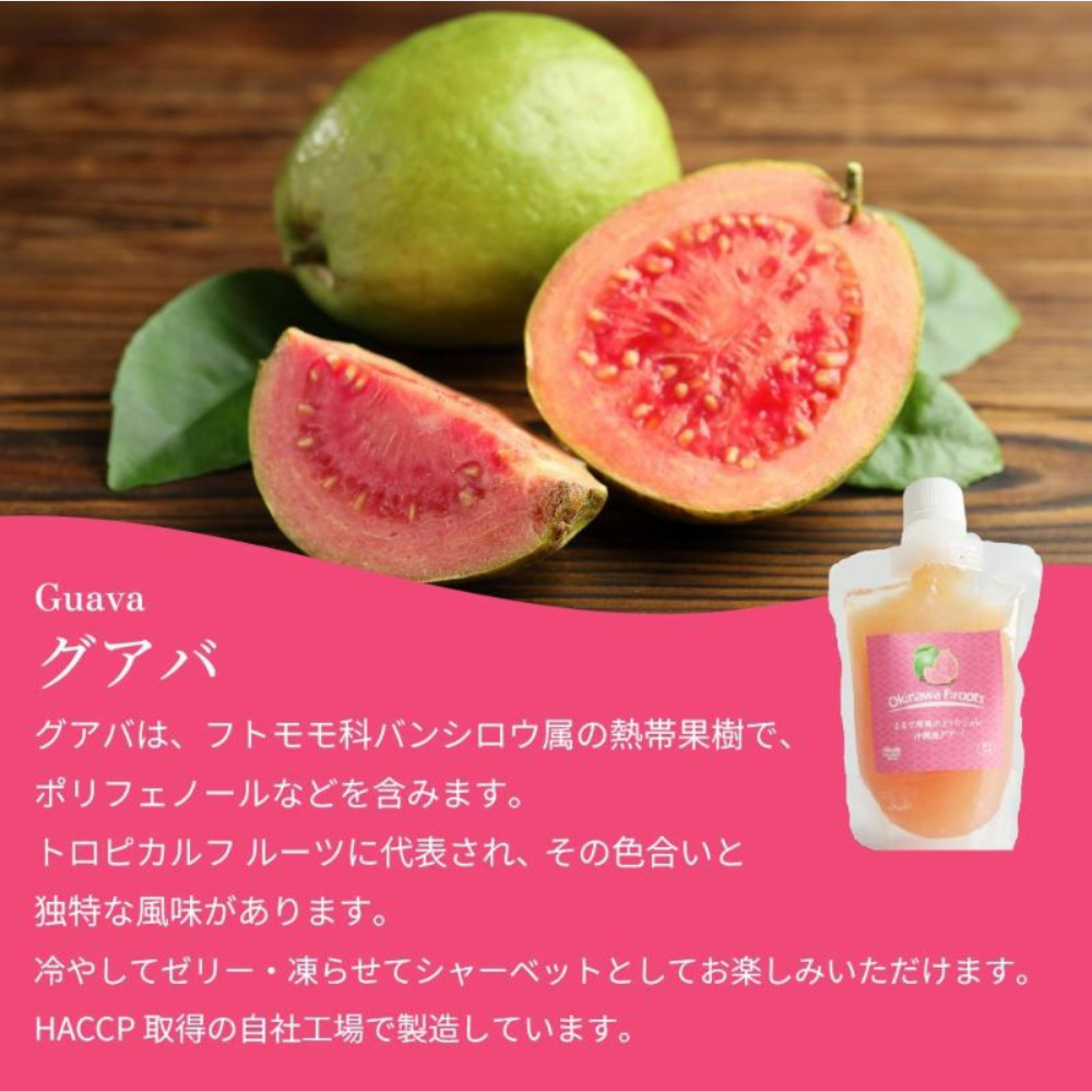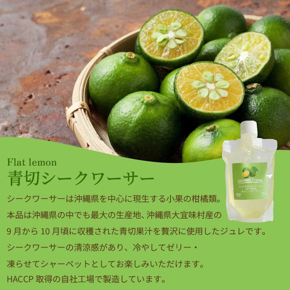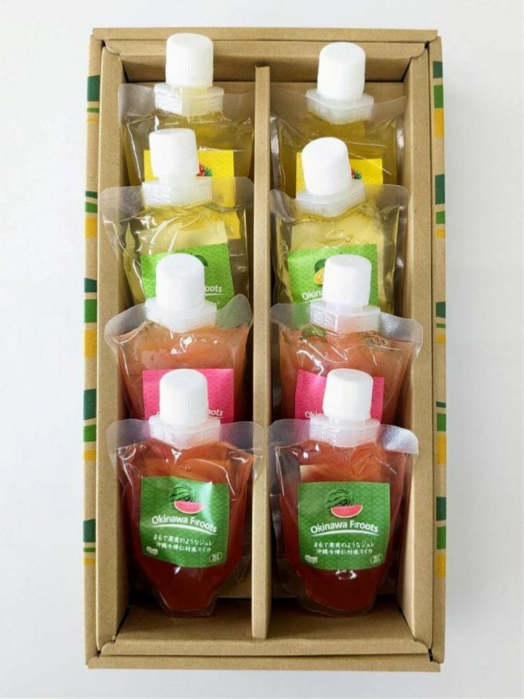 産地にこだわった沖縄の果実を使った4種類のジュレです。 青切りシークヮーサー、パイン、グアバ、スイカを 各2個ずつセットにしました。 冷やしてゼリー、凍らせてシャーベットとしてお楽しみいただけます。 暑い夏には凍らせてシャーベットがオススメです。