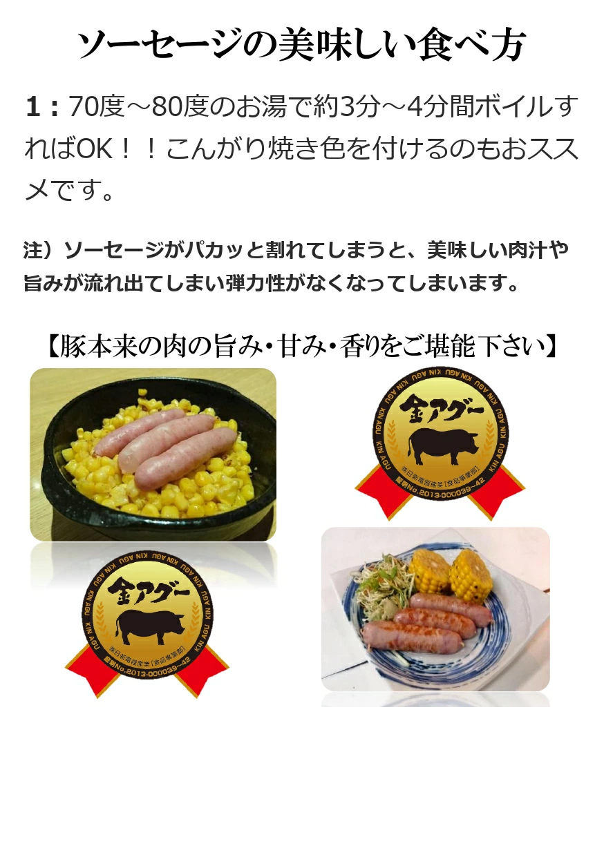金アグー豚のお肉、天然の羊腸にこだわって作りました。天然羊腸ならではの食感、噛んだ瞬間溢れる脂、旨みを堪能できます。