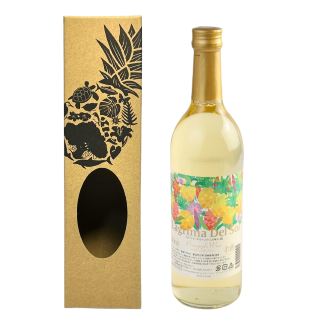 Lagrima Del Sol(ラグリマ・デル・ソル)はスペイン語で “太陽の涙” という意味です。 パイナップルにはクエン酸が豊富に含まれ、その酸味がしっかりとワインの骨格をつくっています。 沖縄パイナップルの甘酸っぱい特徴が感じられます。 パイナップルとその仲間のアナナスを組み合わせた南国らしい明るいタッチのデザインで仕上げました。