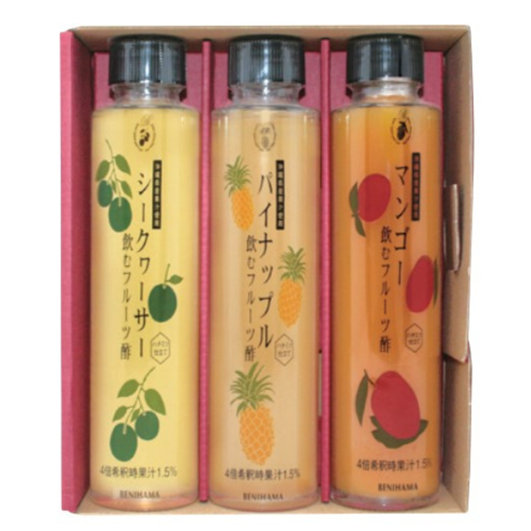 シークヮーサー酢、パイナップル酢、マンゴー酢の3本をセットにしました。
