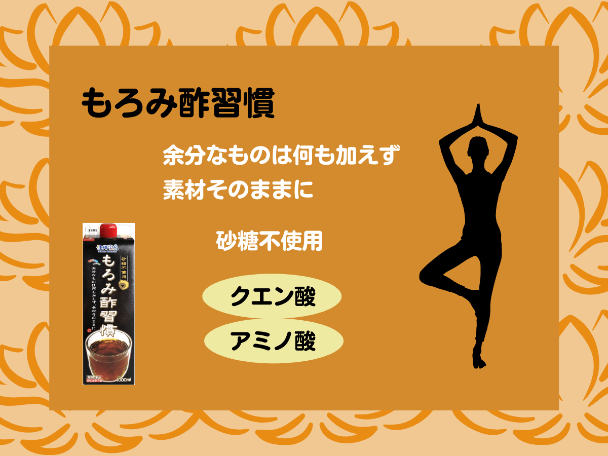 もろみ酢とはクエン酸やアミノ酸を豊富に含んだ、泡盛のもろみ(酒粕)からつくられる清涼飲料水です。一般的なお酢とは違い、鼻にツンとくる酸味がなく、そのまま飲むことができます。