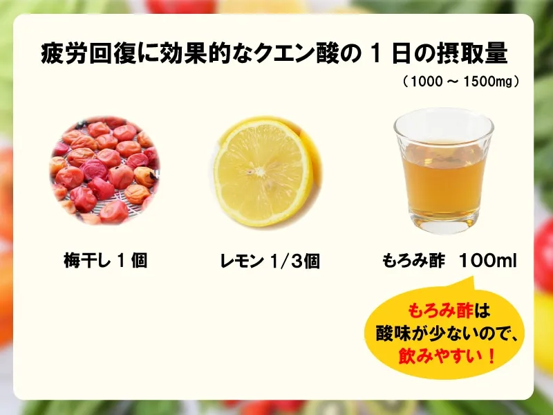 疲労回復のために効果的なクエン酸の摂取量は1日1000~1500mg。もろみ酢100mlで手軽に摂取することができます