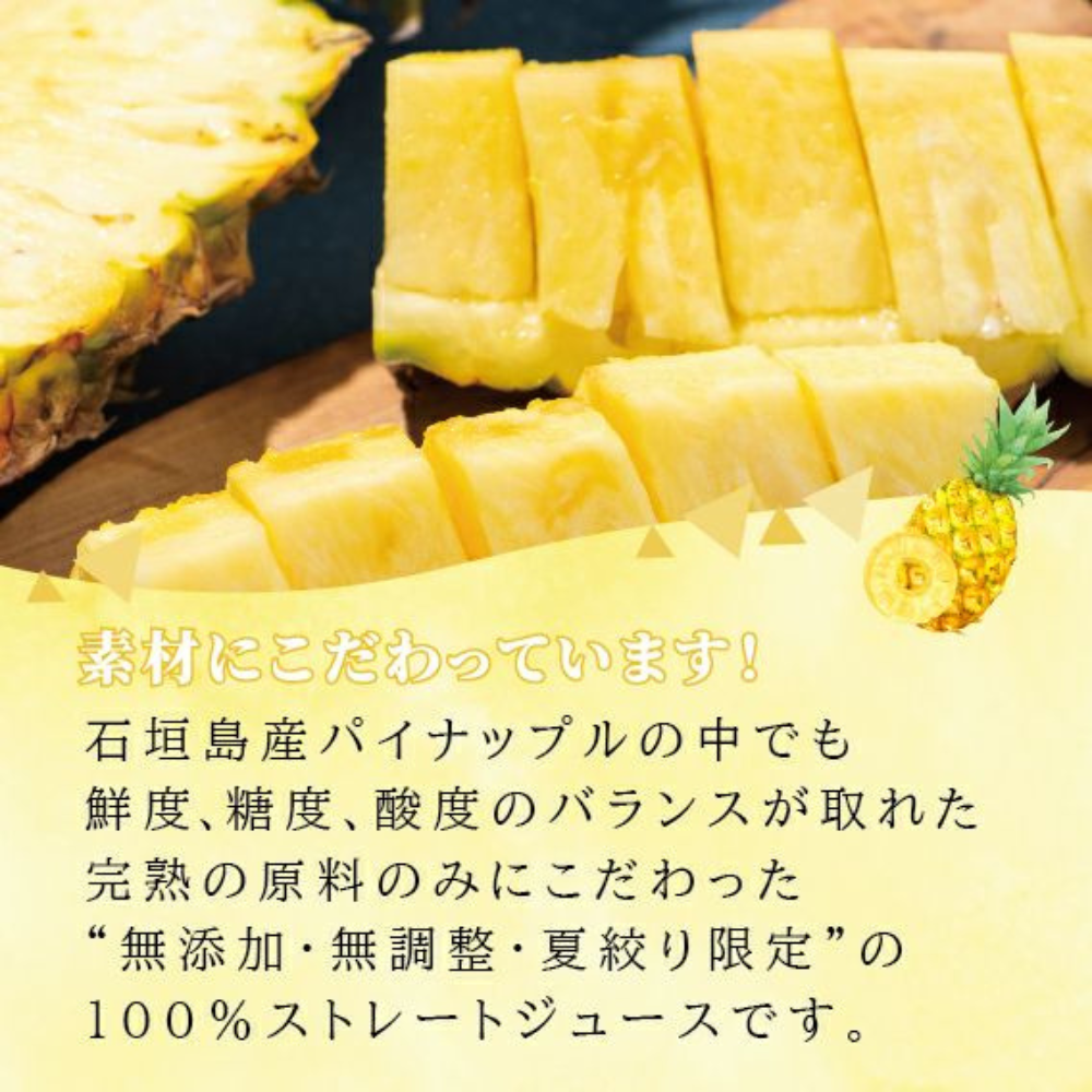 石垣島産パイナップルの中でも鮮度、糖度、酸度のバランスが取れた完熟の原料のみにこだわった「無添加・無調整・夏絞り限定」の100%ストレートジュースです。