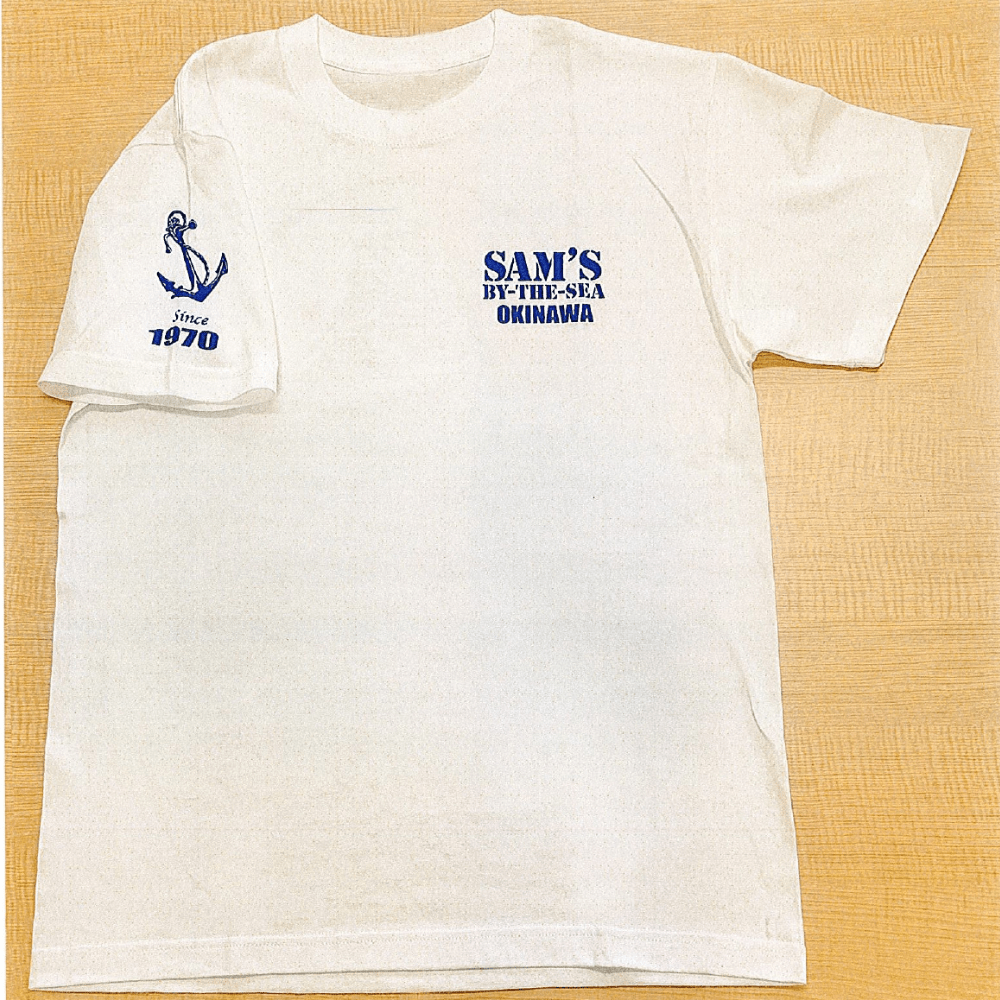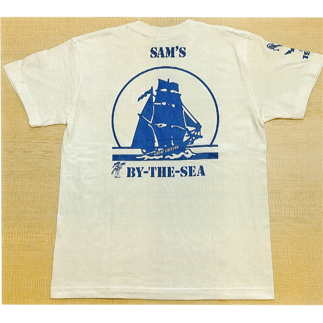 1970年創業のステーキハウス サムズのオリジナルTシャツです。 トレードマークのイカリ、帆船をデザインしています。 シンプルで飽きのこないタイプです。
