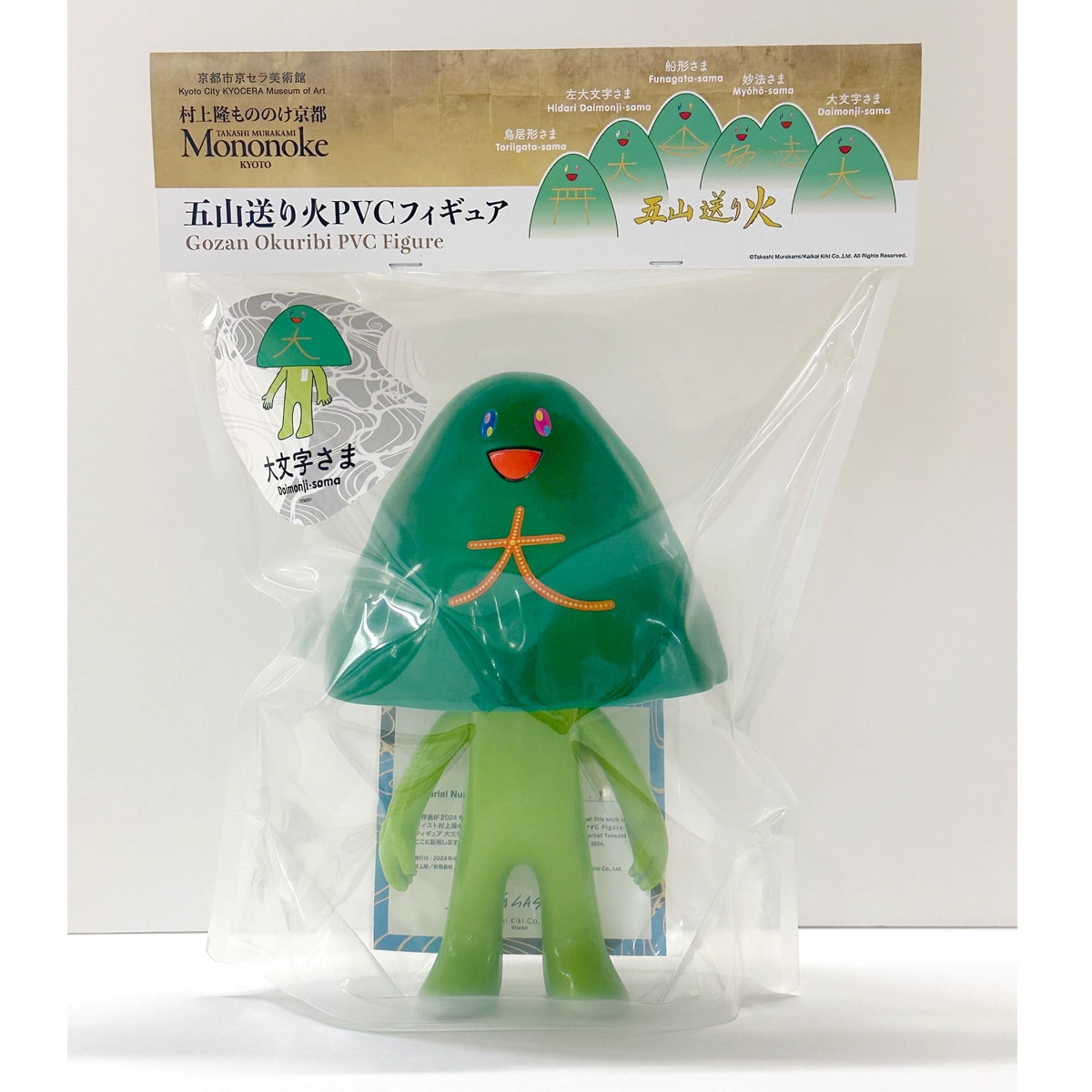 「五山送り火」とは、毎年8月16日に京都の山々で行われる、先祖の霊を見送るための伝統的な行事です。「大」の字が描かれる東山、「妙・法」が灯る松ヶ崎、「船形」が輝く西賀茂、「左大文字」が浮かぶ大北山、そして「鳥居形」が点る嵯峨。これら五つの送り火が、夏の夜空を幻想的に彩ります。この歴史的な行事が、村上隆の独特な視点でキャラクターへと昇華され、フィギュアとして再現されました。