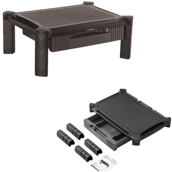 高さ調節対応、引き出し付きモニタライザー。モニタの高さを見やすい位置に引き上げ、デスクトップの省スペースを実現します。丈夫な造りのモニタスタンドは、サイズ32インチ、重さ10kgまでのモニタに対応し、ライザーの下に大きめの収納スペースを取ってあります。段重ね式のライザーはデスク上に手軽に設置でき、下にどんなサイズのノートパソコンでも置けるようになっています。また、文房具などを収納できる引き出しがついています。<最適な高さにモニタを調節>本製品は、ユーザーのニーズにあったワークステーション構成に役立ちます。段重ね式のライザーモジュールを使用しており、コンポーネントを組み合わせて高低を変えることができます。高さは3段階の設定から選択でき、最大高さは168mmとなっています。<デスク周りをすっきり片付け、スペースを有効活用>このモニタスタンドは、すっきりと片付いた作業環境づくりに役立ちます。スタンド面にモニタを乗せて高さを上げ、エルゴノミクス(人間工学)を考慮した環境を作ると同時に、スタンド下には大きめの収納スペース(500mmx330mm)が取れるようになっています。プリンターを乗せてカウンタースペースを広く使えるようにすることも可能です。スタンドの下には、ノートパソコンや私物を置ける十分なスペースがあります。タブレットやスマートフォンの収納に適したフロントポケットもついており、必要なときにすぐ手の届く場所に端末を置いておくことができます。<シンプルなセットアップ>このモニタスタンドは、組み立てが簡単にでき、すぐに使い始めることができます。ライザー脚の底面には滑り止めがついており、デスク面に傷がつかず、作業中にモニタをしっかりと支えます。StarTech.comでは、本製品に5年間保証と無期限無料技術サポートを提供しています。