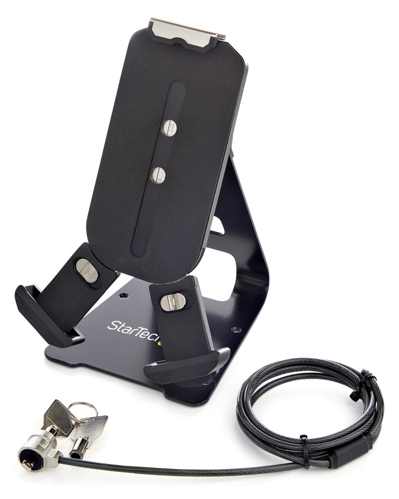 タブレットホルダー(7.9インチ-13インチ対応)。タブレットに搭載されたポート、ボタン、カメラへのアクセスを確保したまま、タブレットをセカンドディスプレイやPOS端末として活用できます。厚さ9.5mm、重さ0.7kgまでのタブレットに対応します。ロック機能付きの伸縮可能グリップアームは、タブレットをしっかりと固定し、操作中やタイピング中の落下を防ぎます。<可動域>180°の上下振り(チルト)と360°回転に対応し、横長・縦長のどちらでも、用途によって見やすい角度に調整可能です。2つの回転軸により、小型タブレットと大型タブレットのどちらでも同じ可動域を提供します。<セキュリティ機能>このタブレットスタンドは、特に監視がない環境でのセキュリティを考慮して設計されています。標準セキュリティスロット(ケンジントンスロット)が2個ついているので、連結用セキュリティワイヤーロック(BRNCHLOCK)(別売)を使用してマルチロック設定が可能です。さらに、付属のネジを使用して、デスクやカウンターにネジ止めし、セキュリティを強化することもできます。<考え抜かれたデザイン>グリップアームにはフォームパッドとスペーサーが組み込まれています。サイズが異なるデバイスを傷や擦り傷から守りながら、大きさに合った位置に保持します。また、机や設置面を保護するゴム足パッドも製品に付属しています。ホルダーには配線用の開口部があります。背面にケーブルを通し、すっきりとしたセットアップを保ちます。StarTech.comでは、本製品に2年間保証と無期限無料技術サポートを提供しています。