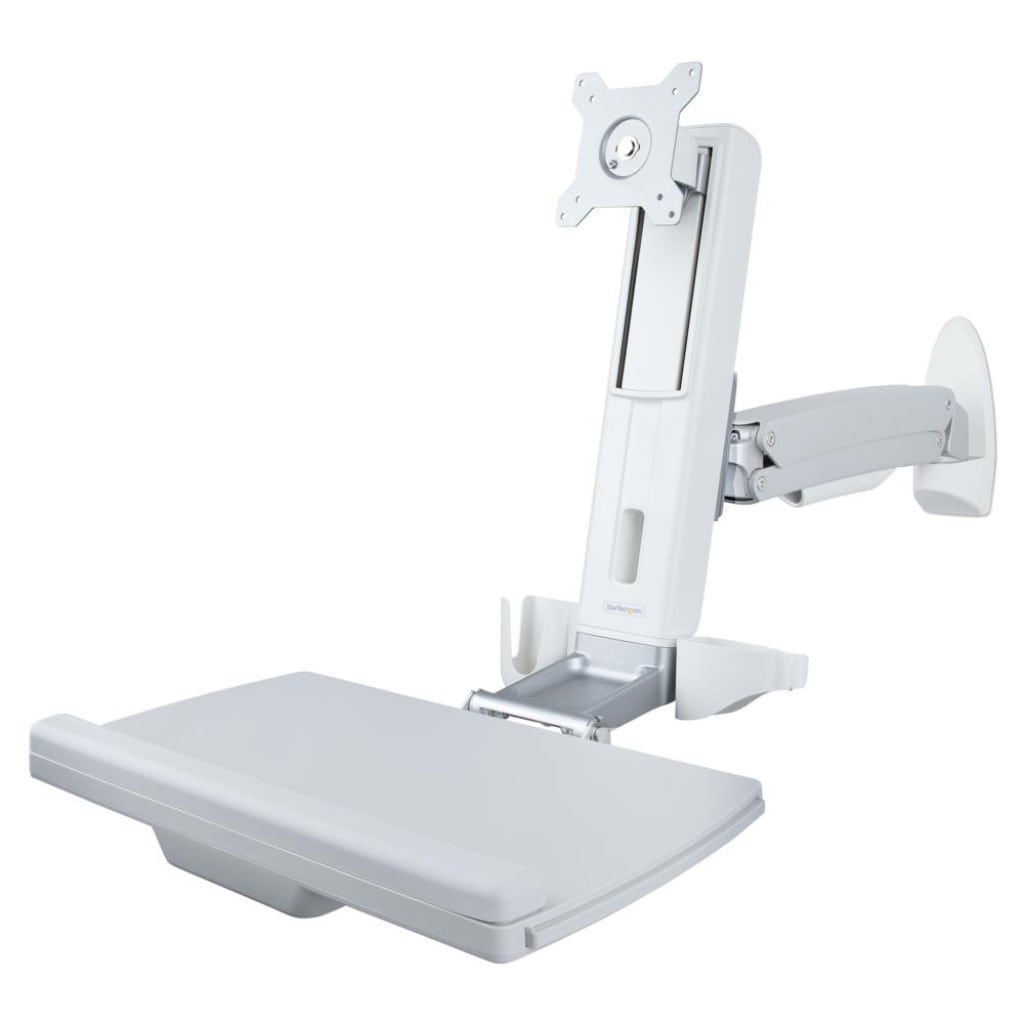 ワークステーションをスタンディングデスクに簡単変換。より快適で仕事がはかどる環境を実現 ウォールマウント型昇降デスク。人間工学に基づいた設計で疲れにくいスタンディングデスク環境を構成することができます。オフィス、研究所、診療所、倉庫など、通常のデスクを置くスペースがないエリアに最適なソリューションです。このオフィスワークステーションは、折りたたみ式のキーボードと、両利き用のスライド式マウスパッドトレイを備えています。スプリングアシストアームで高さの調節が可能なので、簡単に立ち姿勢と座り姿勢を切り替えることができます。また、ユーザーが快適に作業できるように、作業に応じて本体位置を上下左右に調整することが可能です。<スムーズな動きで高さを調節>内蔵のハンドルを使って、スムーズな操作でポジションを変更できます。最大43.8cmまで作業面の高さ調整が可能です。また、ユーザーのニーズに合わせて、高さ調整のテンションを変更することもできます。VESA(75x75/100x100)モニターマウントは、モニターの支柱に沿って最大12.4cmの独立した高さ調節が可能です。<最適な位置調整>VESA規格のモニターマウントは、シングルモニター(最大27インチまたは34インチのウルトラワイド)に対応し、+35/-5度の上下振り調整が可能です。また、360度の回転で、モニターの向きを簡単に縦横変更することができます。<キーボード & マウストレイ>大型キーボードトレイ(44.9 x 20.7cm)付きで、マウスパッドトレイ(21.9 x 21.3cm)は、ユーザーの利き腕に合わせて左右どちらにでも引き出すことができます。別売のPCホルダー(CPUWALLMNT)にPCを固定して本製品と組み合わせ、すべて壁面設置でオフィスワークステーションを揃えることも可能です。