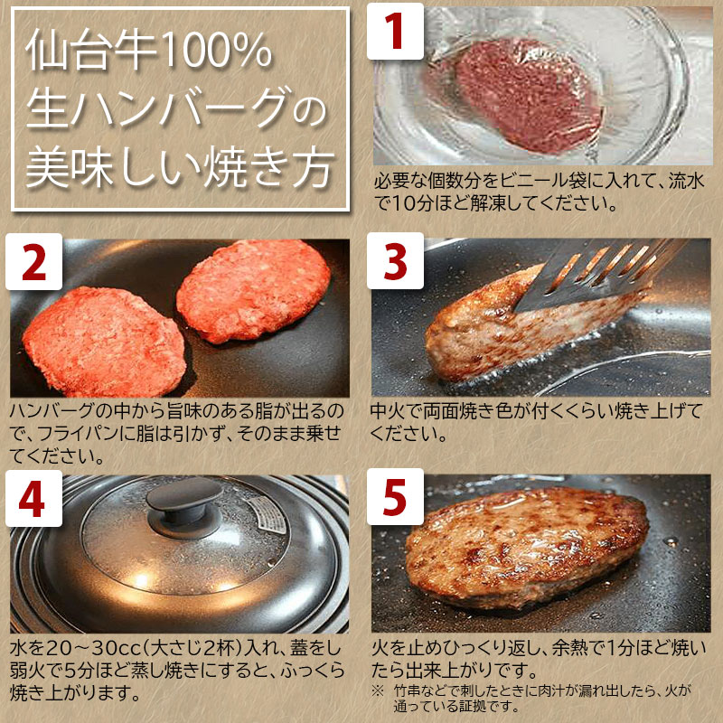 | 原材料 | 牛肉 (仙台牛)、ソテーオニオン (玉葱(国産)植物油)、つなぎ (パン粉、卵)濃厚ソース、トマトケチャップ、食塩、ブラックペッパ一、 ナツメグ、 (一部に小麦・卵・大豆・牛肉・りんごを含む) |